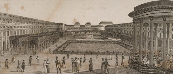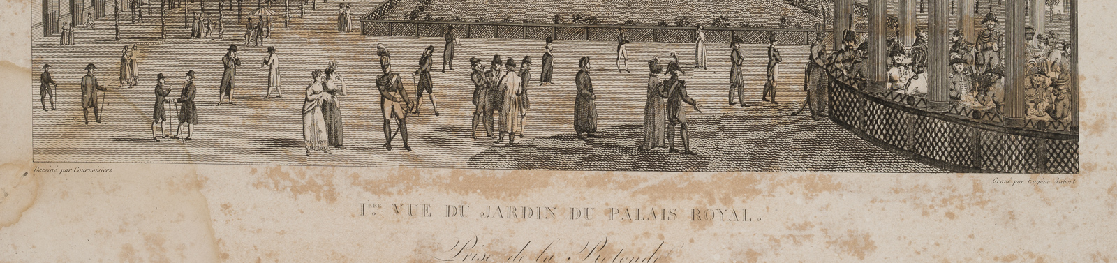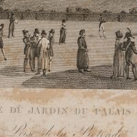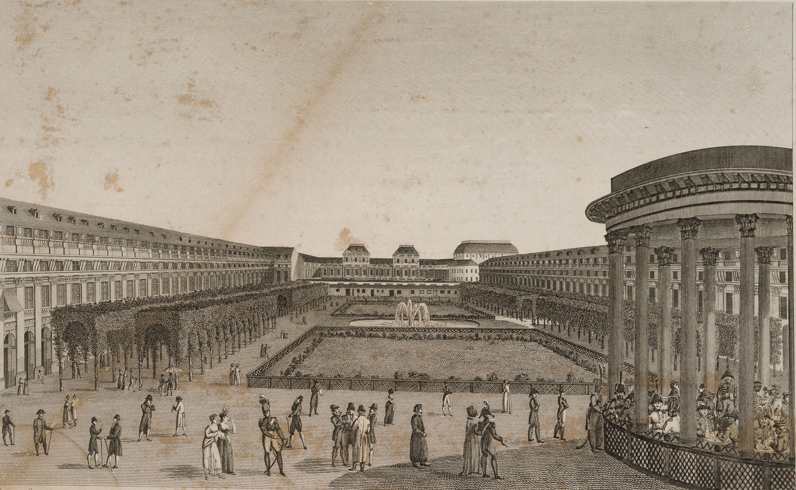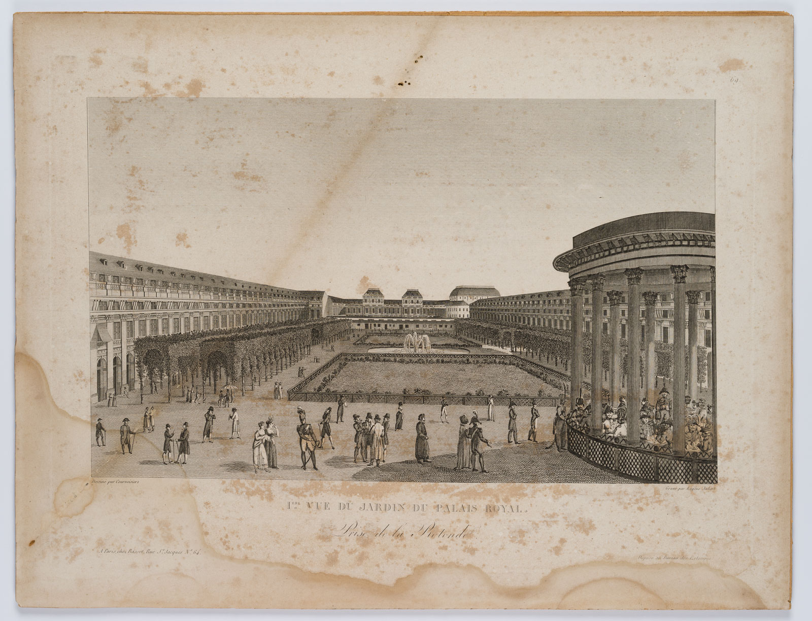 Pierre Eugène Aubert (1789 – 1847 ) after Pierre Courvoisier (1756 La Flèche (Sarthe) – 1804 Paris), Pariser Stadtansicht View of the Royal Palace garden, 19th century, Copper engraving