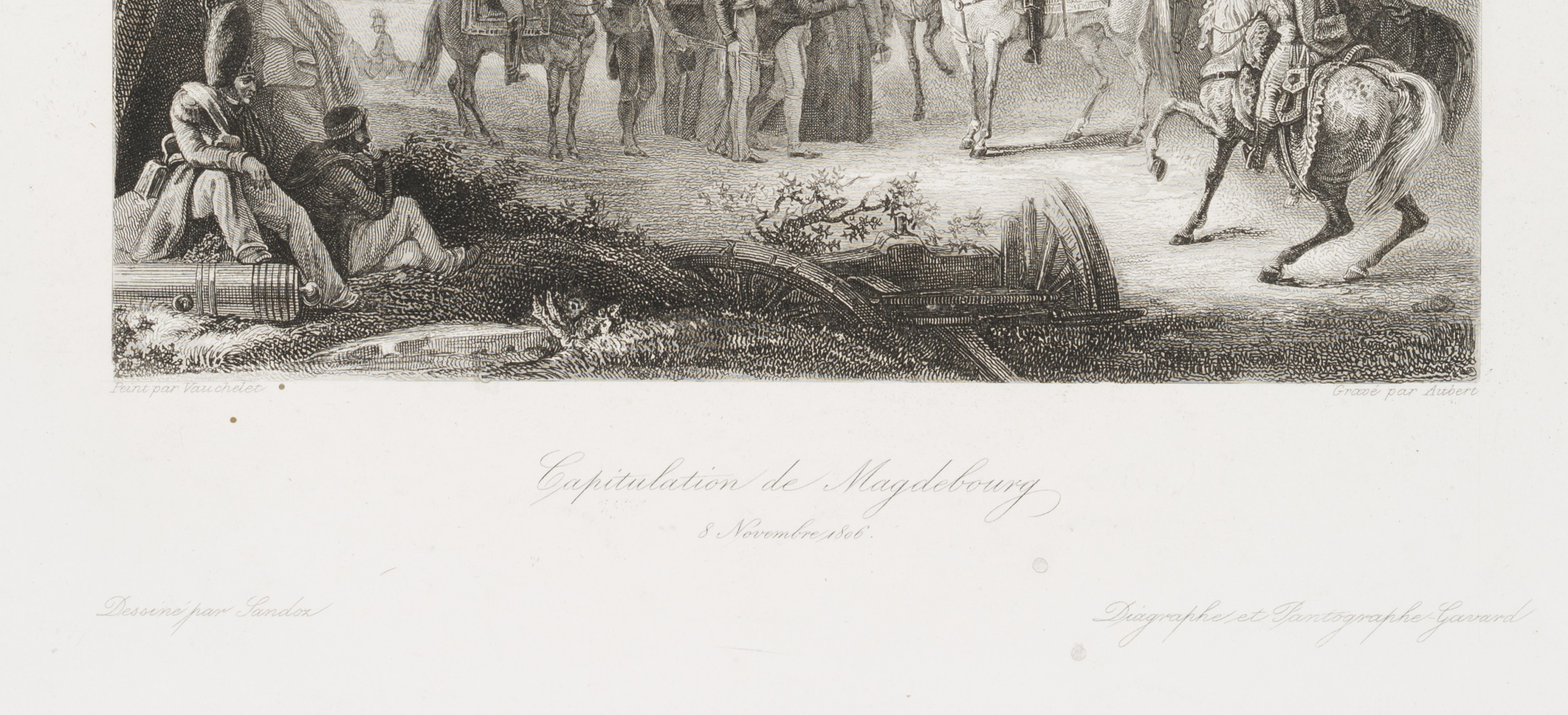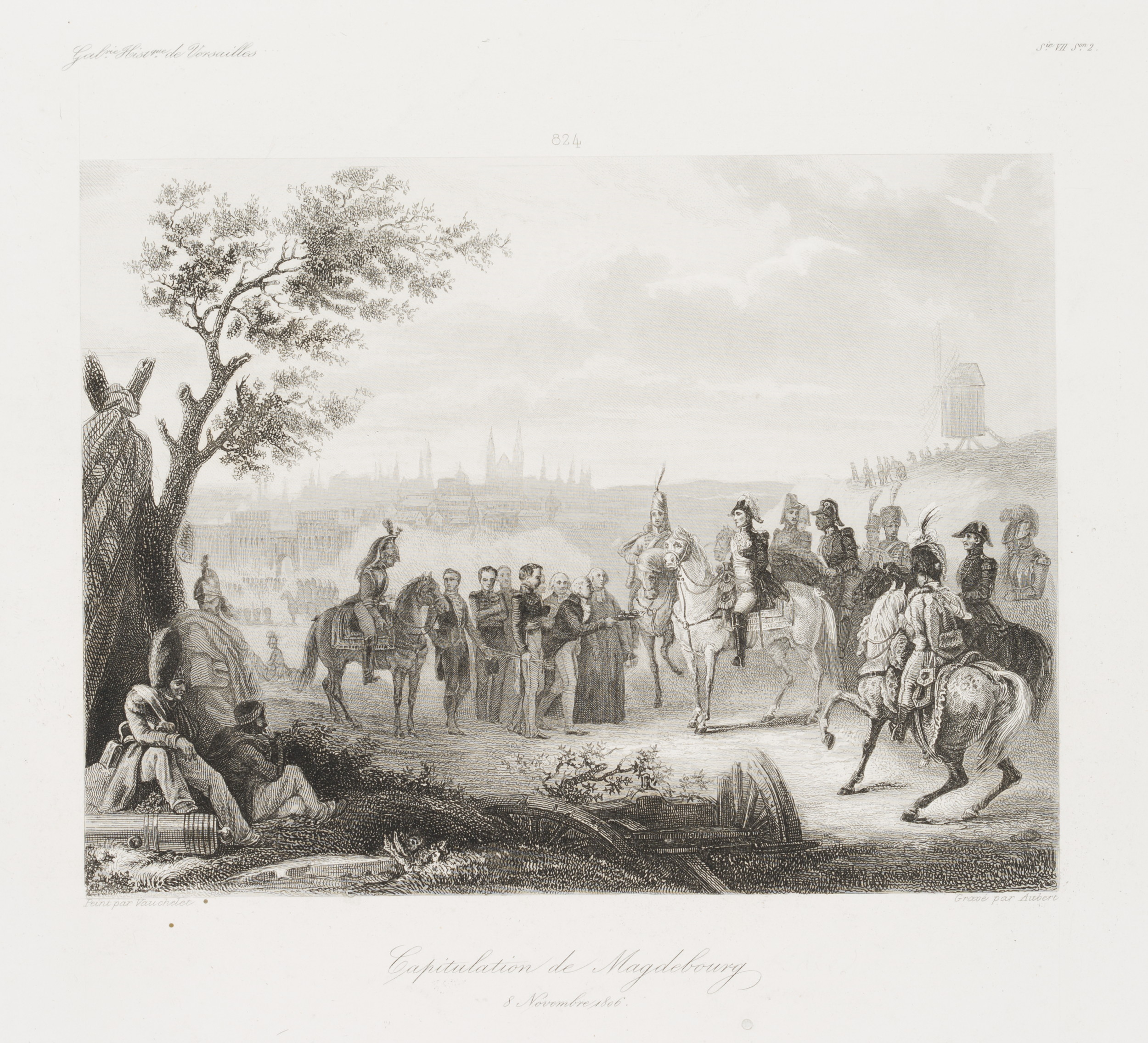 • Inscription: Lower middle signed in the printing plate: “Peint par Vauchelet | Gravé par Aubert”. Lower middle inscribed in the printing plate: “Capitulation de Magdebourg | 8 Novembre 1806.”. Upper middle numbered in the printing plate: “824 | Sie. VII Son. 2.”.