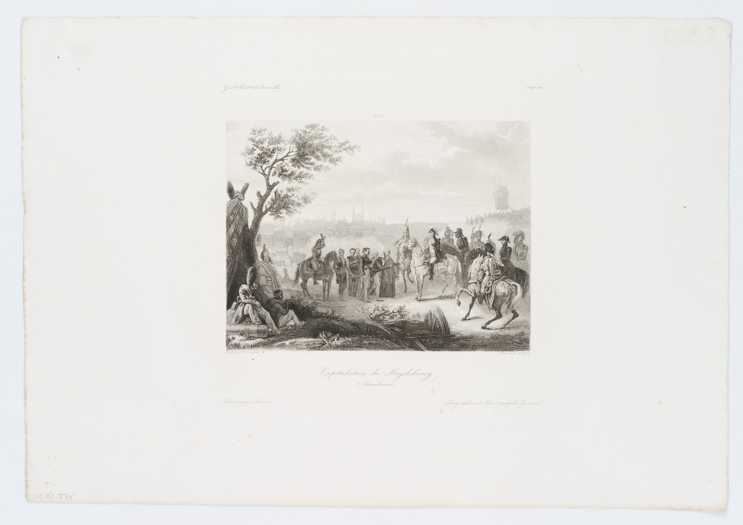 • Bezeichnung: Unten mittig im Druck signiert: “Peint par Vauchelet | Gravé par Aubert”. Unten mittig im Druck bezeichnet: “Capitulation de Magdebourg | 8 Novembre 1806.”. Oben mittig im Druck nummeriert: “824 | Sie. VII Son. 2.”.