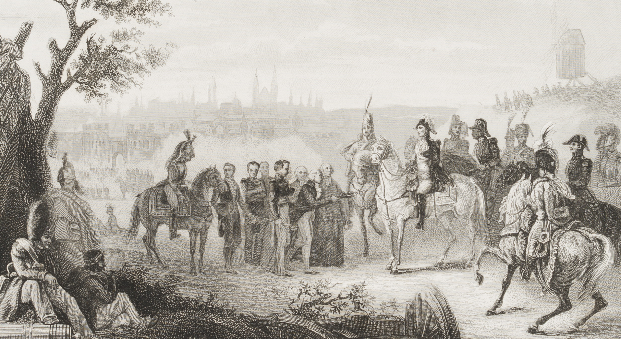 Pierre Eugène Aubert (1789 – 1847 ) after Théophile Vauchelet (1802 – 1873 ibid.), Surrender of Magdeburg (1806) At the gates of the city, the people of Magdeburg surrender to Napoleon’s master, after 1806, Steel engraving