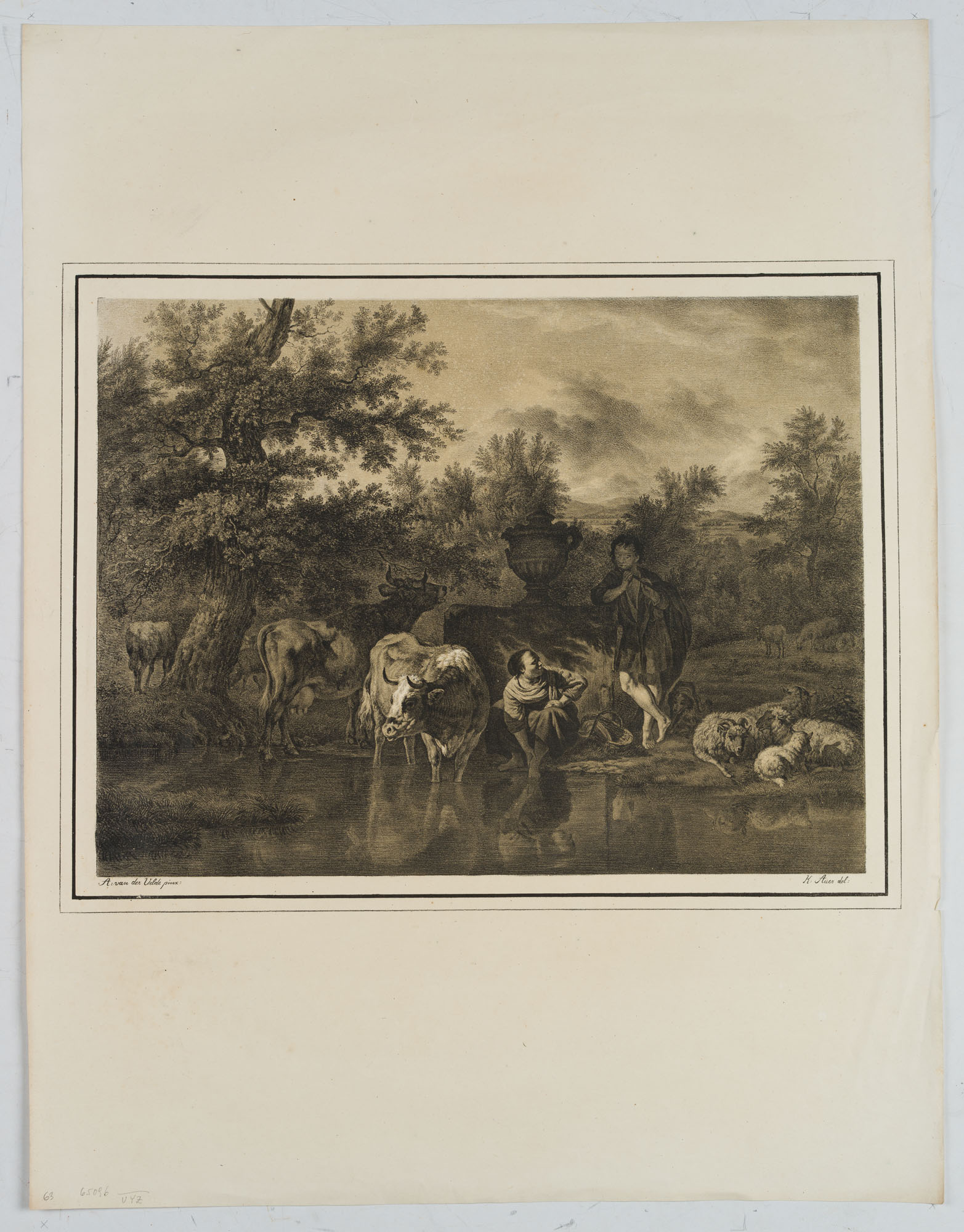 Caspar Auer (1795 Nymphenburg – 1821 München) nach Adriaen van de Velde (1636 Amsterdam – 1672 ebd.), Pastorale Landschaft mit weidendem Vieh und Schäfern am Ufer eines Gewässers, um 1820, Lithographie