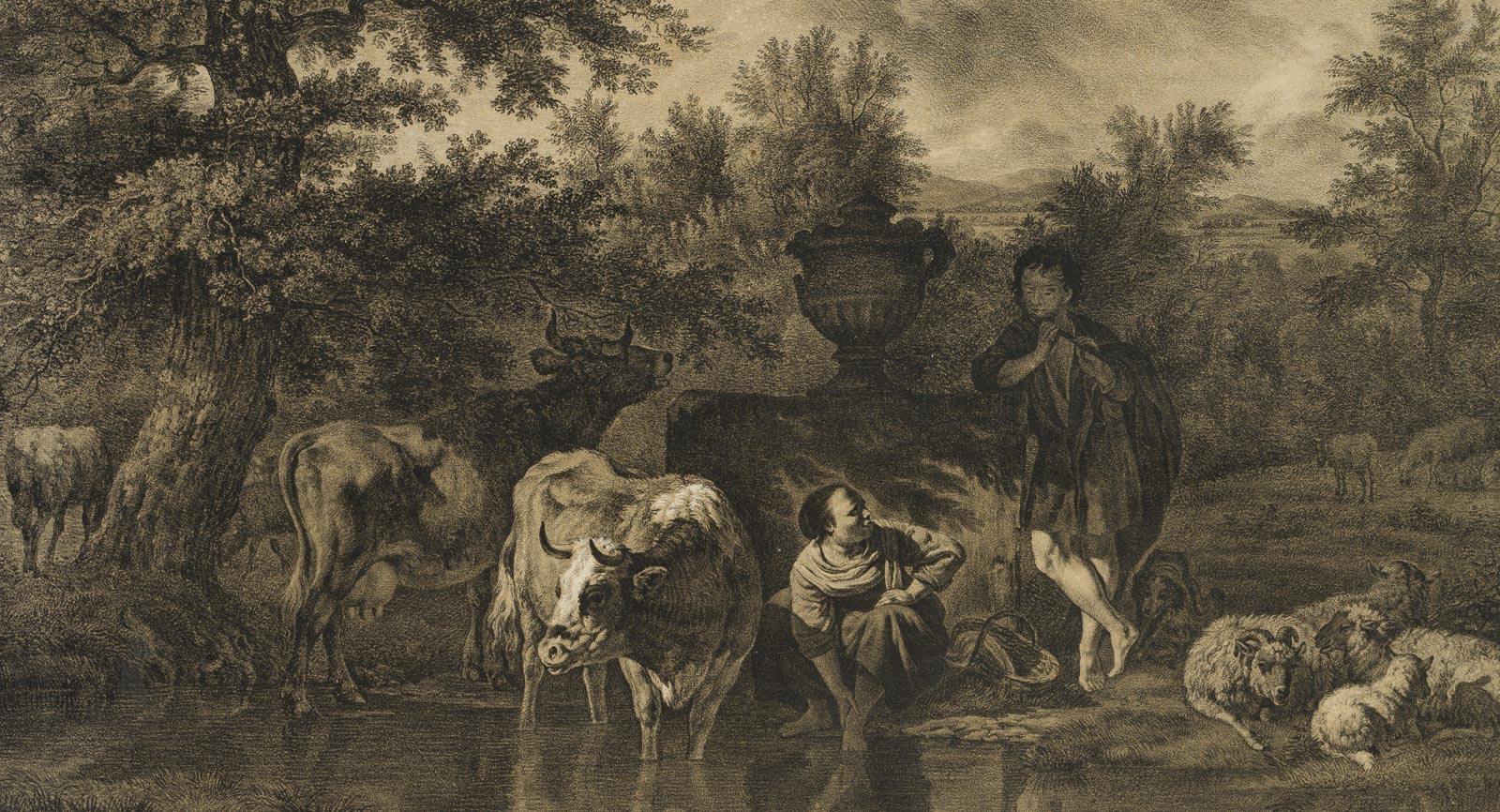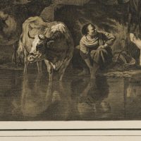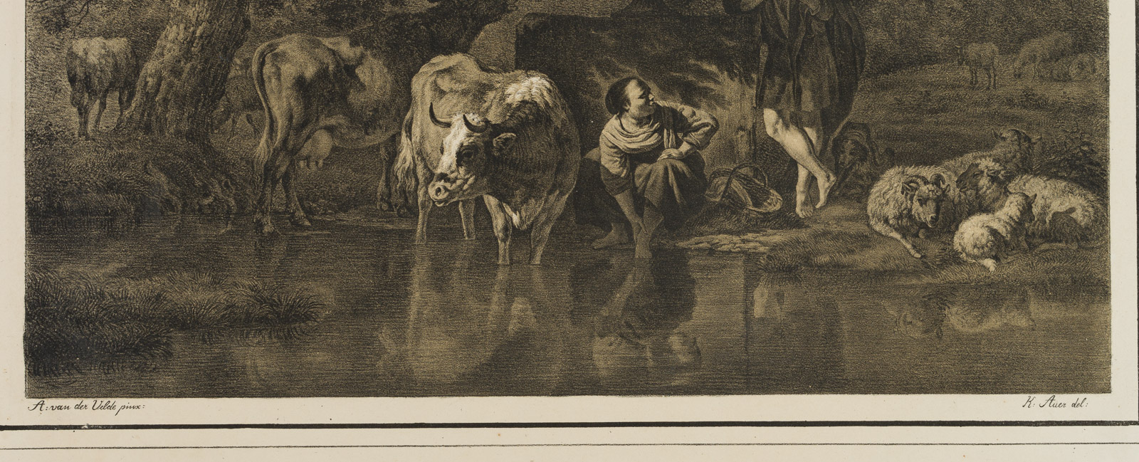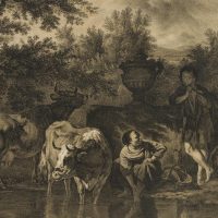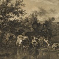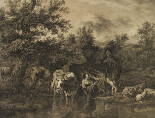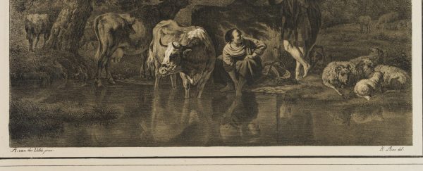Caspar Auer (1795 Nymphenburg – 1821 Munich) after Adriaen van de Velde (1636 Amsterdam – 1672 ibid.), Pastoral landscape with grazing cattle and shepherds on the bank of a watercourse, c. 1820, Lithography