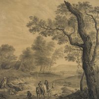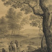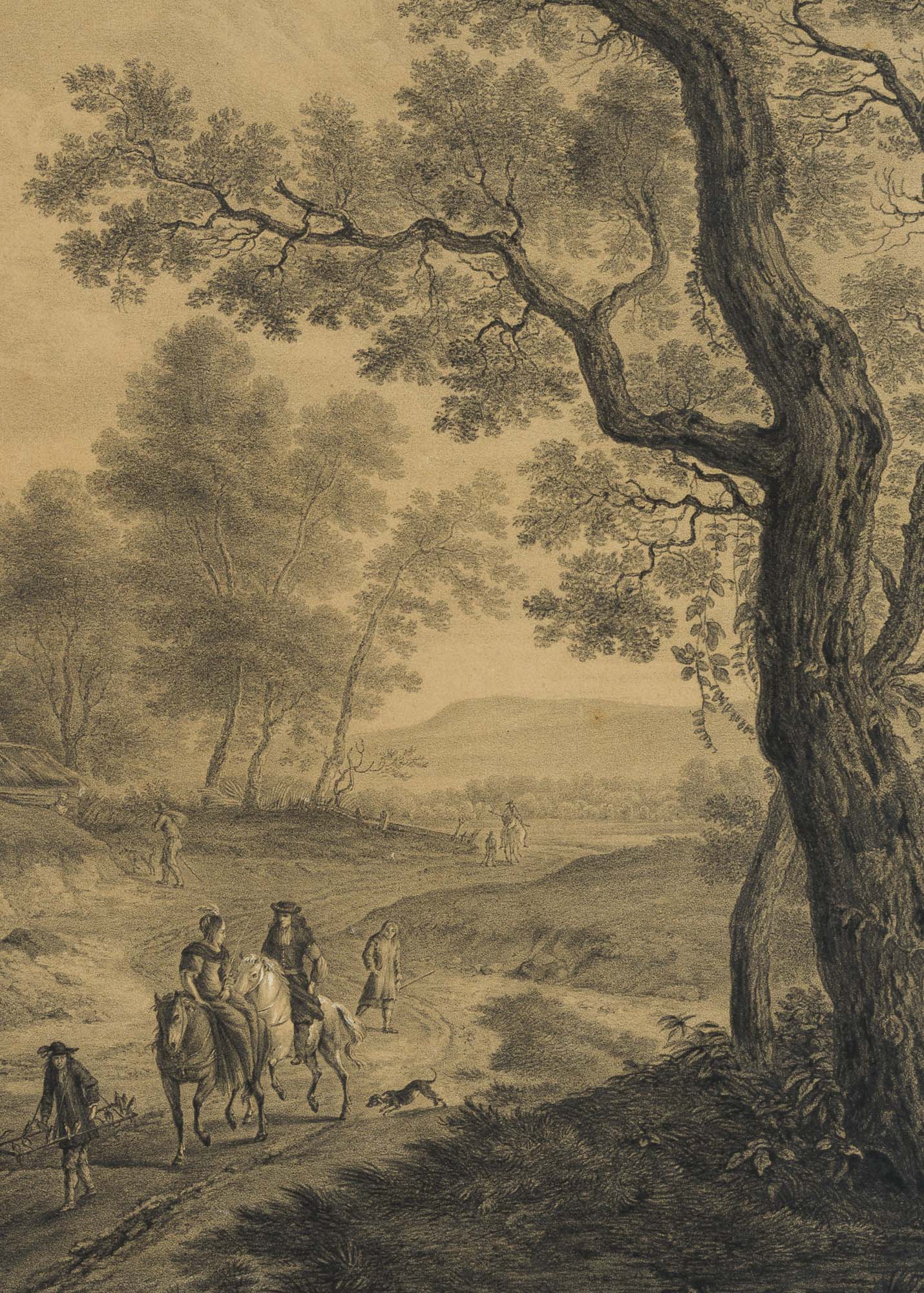 Caspar Auer (1795 Nymphenburg – 1821 München) nach Jan Wijnants (1632 Haarlem – 1684 Amsterdam), Blick auf eine belebte Landstraße, die durch eine Wald- und Weidenlandschaft führt, 1820, Lithographie