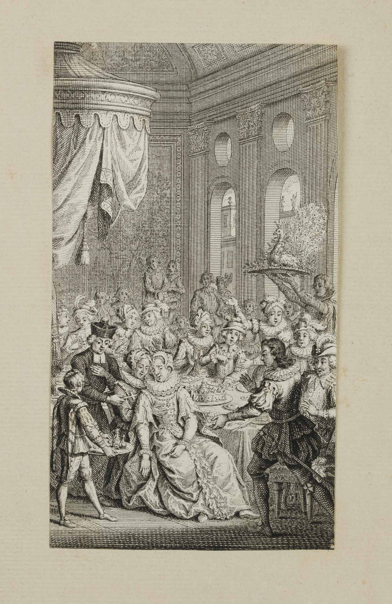 - Description: Historicising costume scene. One of the countless miniatures and illustrations of contemporary literature by the Dutch artist Jacob Folkema. Showing a courtly banquet in a baroque state hall. From a famous antiquarian bookshop in Munich.