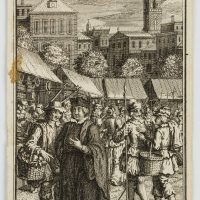 - Description: Costume scene. One of the countless miniatures and illustrations of contemporary literature by the Dutch artist Jacob Folkema. Depicts a scene in a marketplace near a town with magnificent classical buildings. In the foreground a peasant and a clergyman are engaged in conversation.