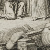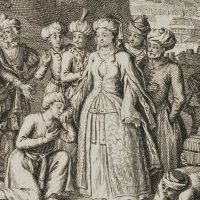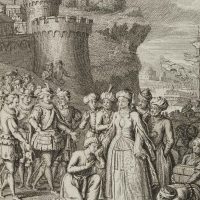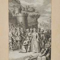 - Beschreibung: Historisierende Kostümszene. Eine der unzähligen Miniaturen und Illustrationen zeitgenössischer Literatur des niederländischen Künstlers Jacob Folkema. Zeigt eine höfische Gesellschaft vor einer Burg, die eine orientalische Prinzessin oder Königin mit ihrem Gefolge empfängt.