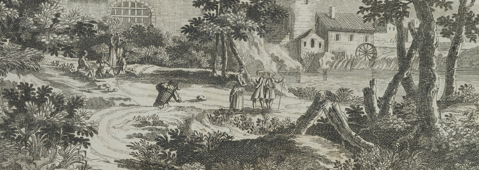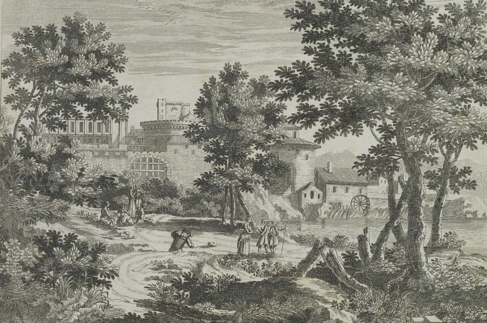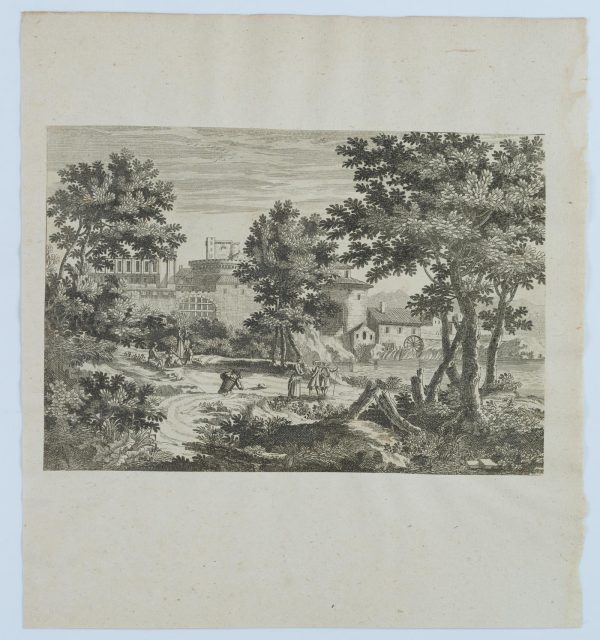François-Antoine Aveline (1718 – um 1762 ) nach Johanna Sibylla Küsel (um 1650 Augsburg – 1717 ebd.), Detailreich geschilderte mediterrane Landschaft mit Stadtanlage am Ufer mit reicher Vegetation und Personenstaffage, 18. Jahrhundert, Kupferstich