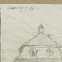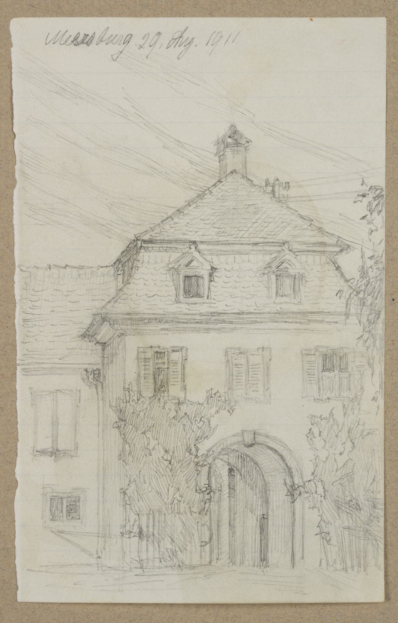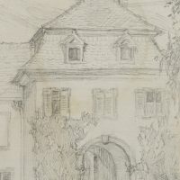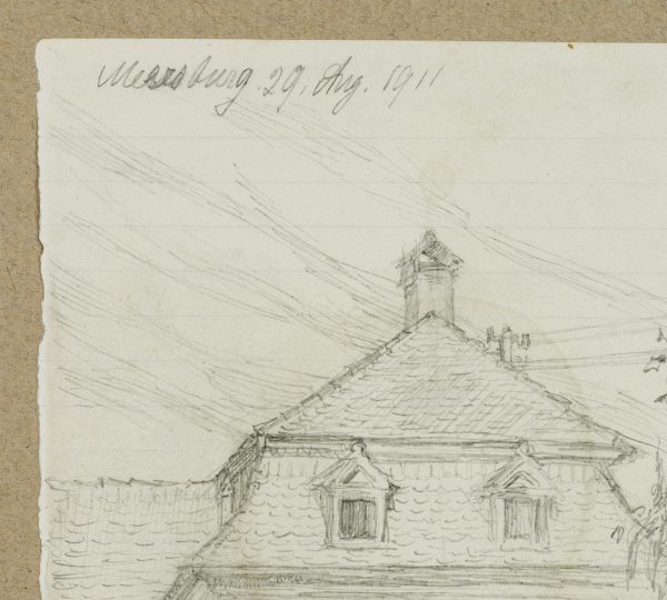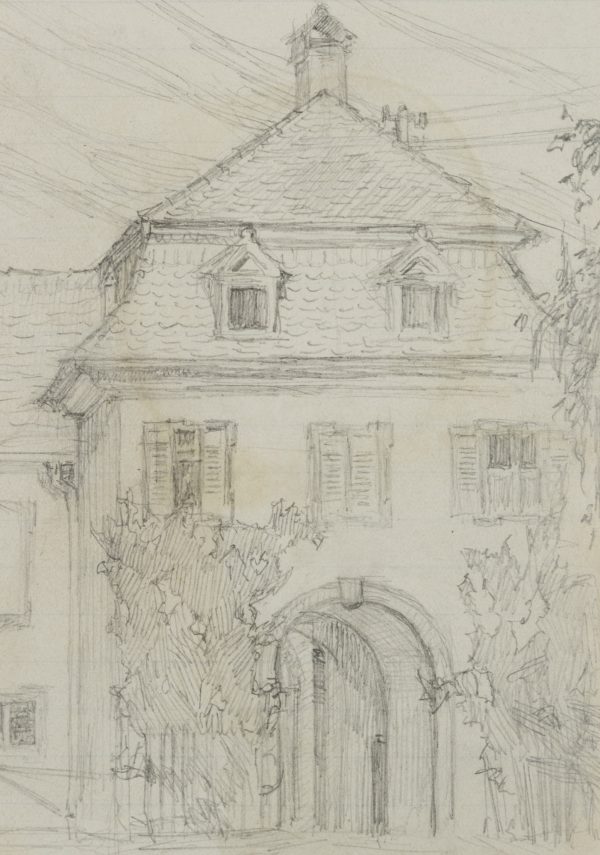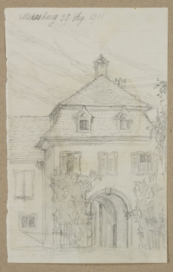 - Description: View of a town house with a high gate, inscribed above with “Meersburg, 29 Aug. 1911”. The sheet comes from a collection of drawings by Bruno Burger. Please note our further offer.