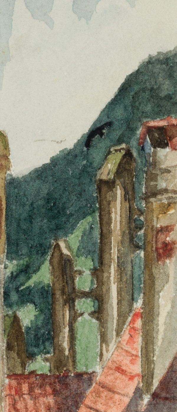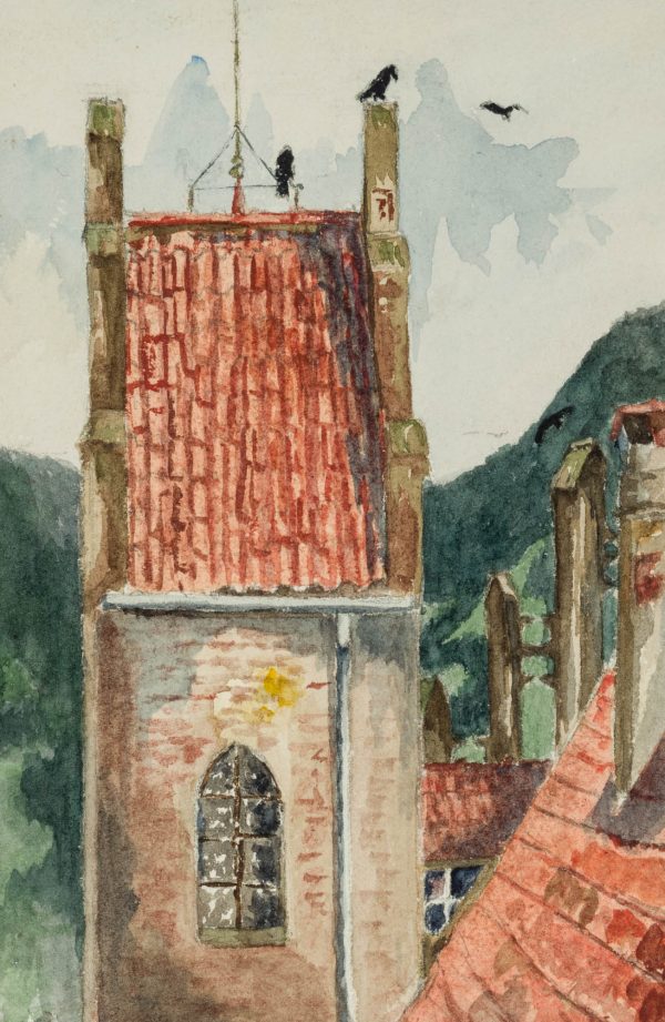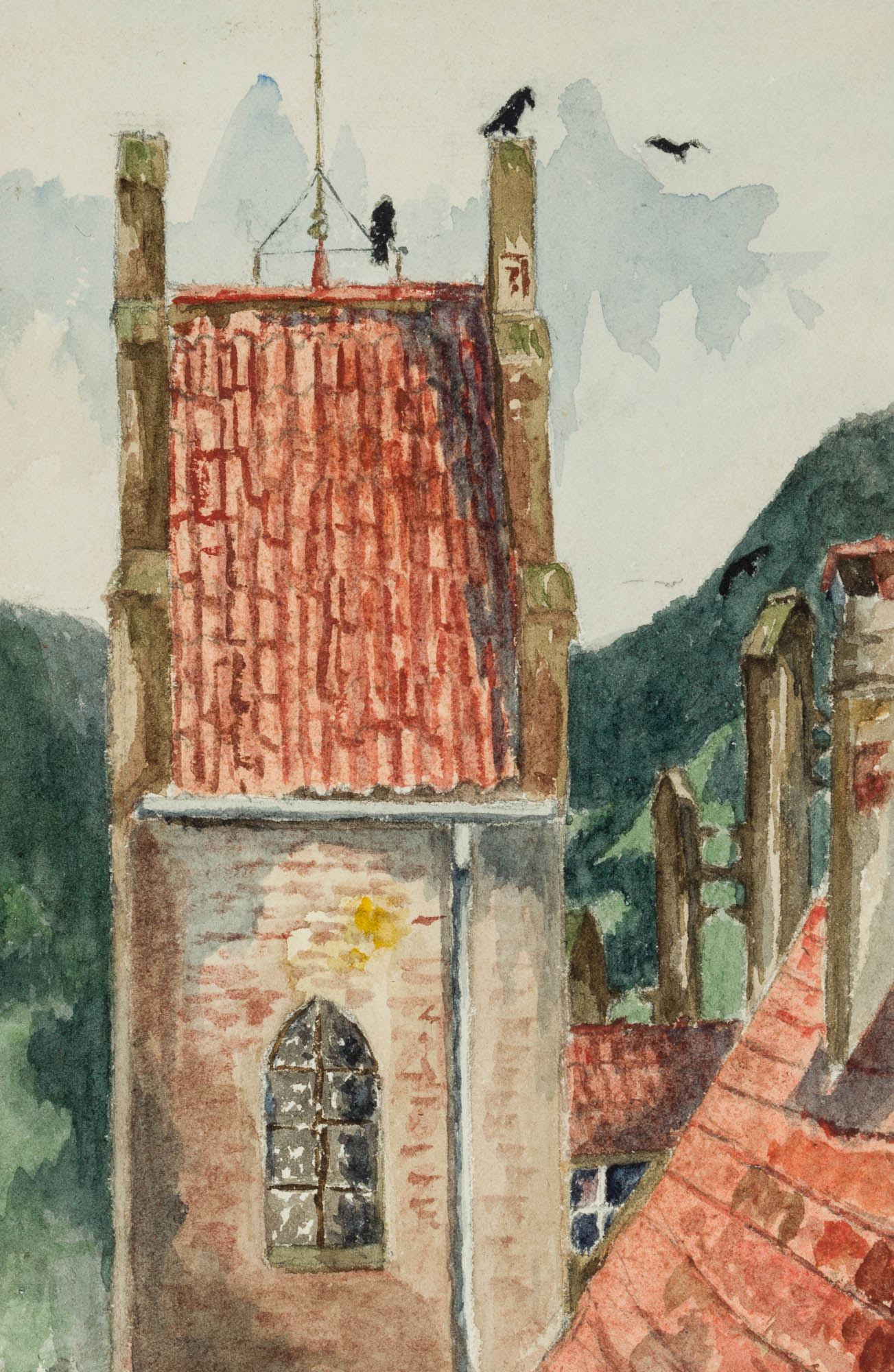 - Description: Very beautiful landscape and architectural drawing, with a brick tower standing in the centre. It is surrounded by forest and hills. The sheet comes from a collection folder with drawings by Bruno Burger. Please note our further offer.