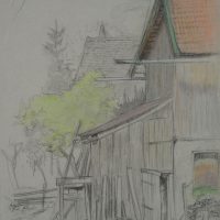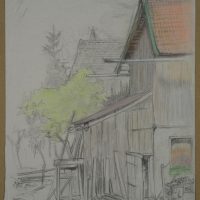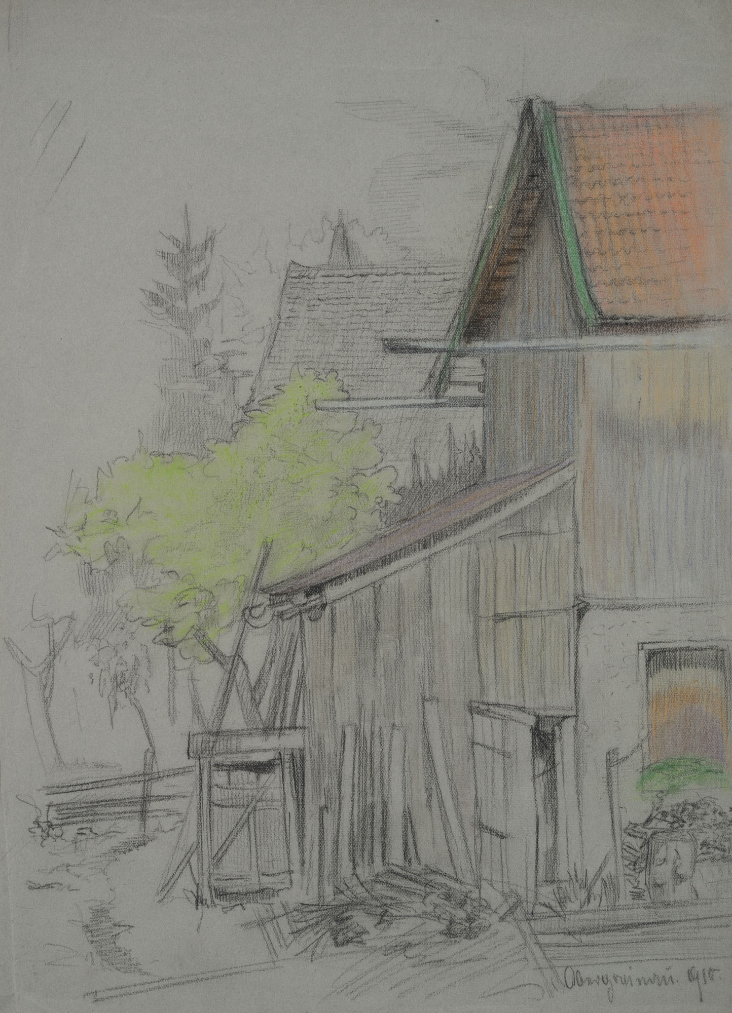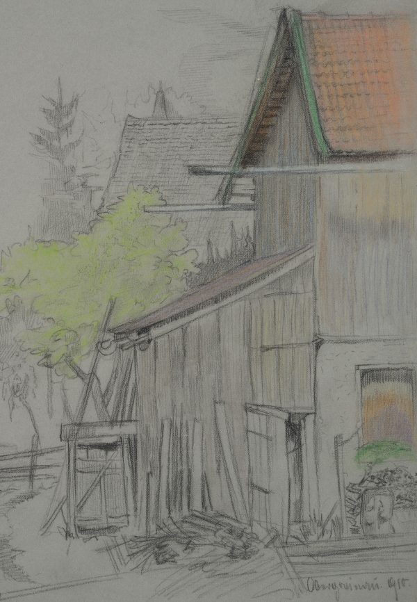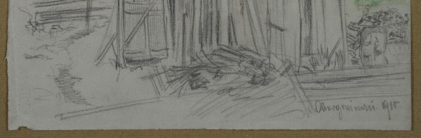 Bruno Burger (1892 – 1968 ), Blick auf einen Hinterhof mit Schuppen und gestapeltem Brennholz, 1915, Bleistift