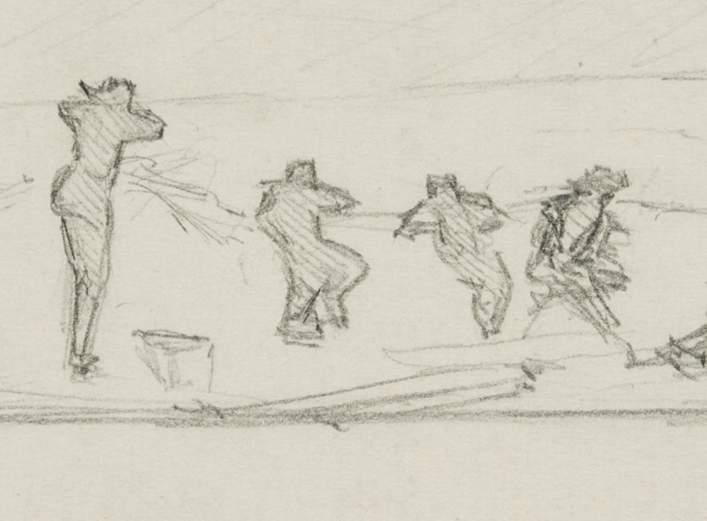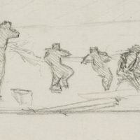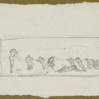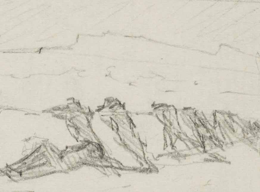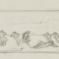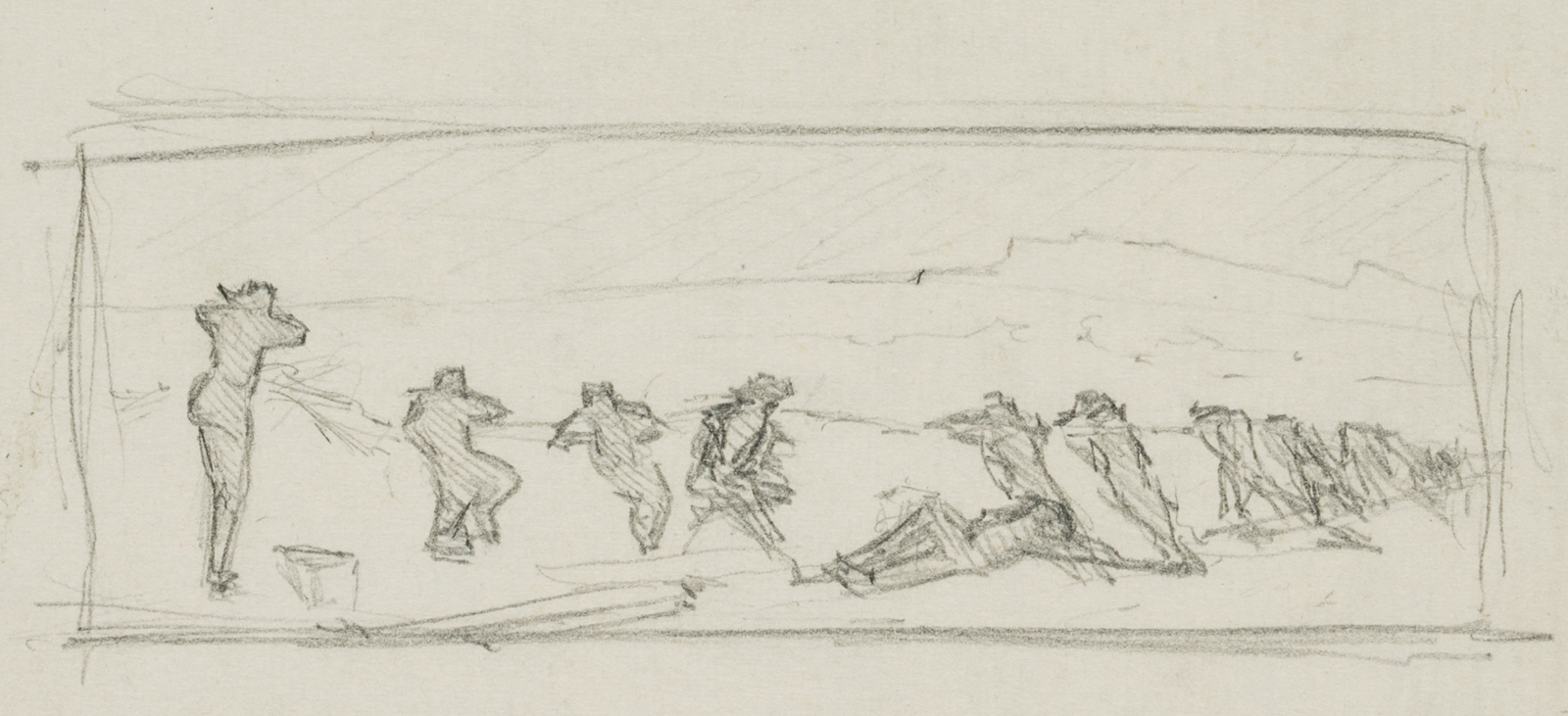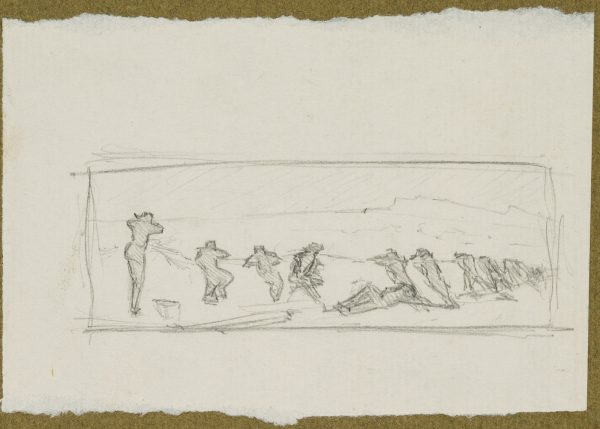 - Description: Study of a figure in reverse view; soldiers defend themselves under the protection of a wall. The sheet comes from a collection folder with drawings by Bruno Burger. Please note our further offer.