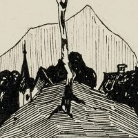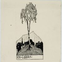 - Bezeichnung: Unterhalb der Darstellung bezeichnet mit: “EX-LIBRIS:”. Das in Tusche gezeichnete “Exlibris” (von lat. “aus den Büchern von…”) zeigt eine Birke auf einem kleinen Hügel, im Hintergrund ist eine Landschaft mit Kirche und Haus zu sehen.
