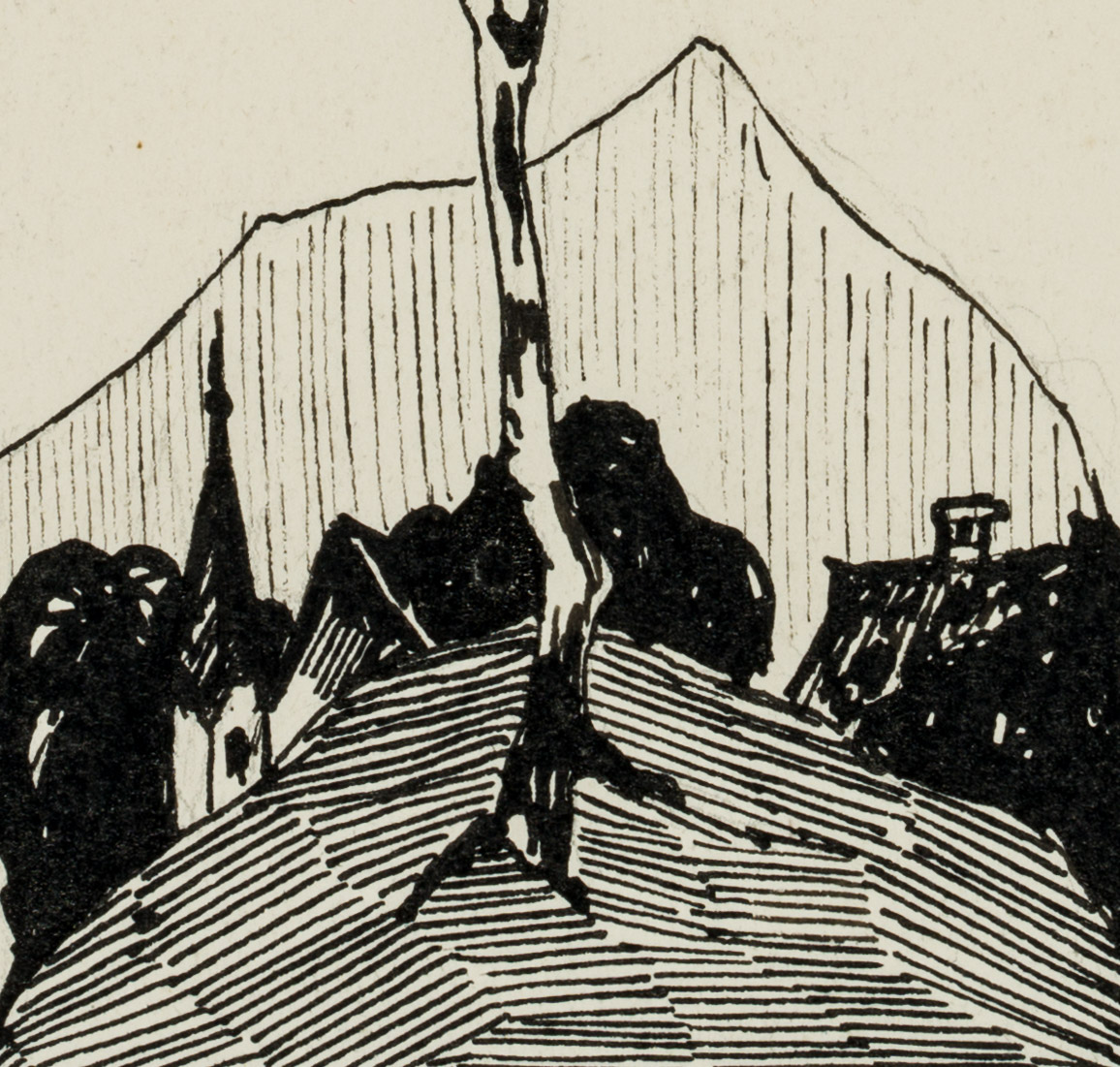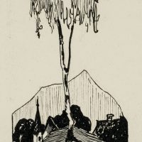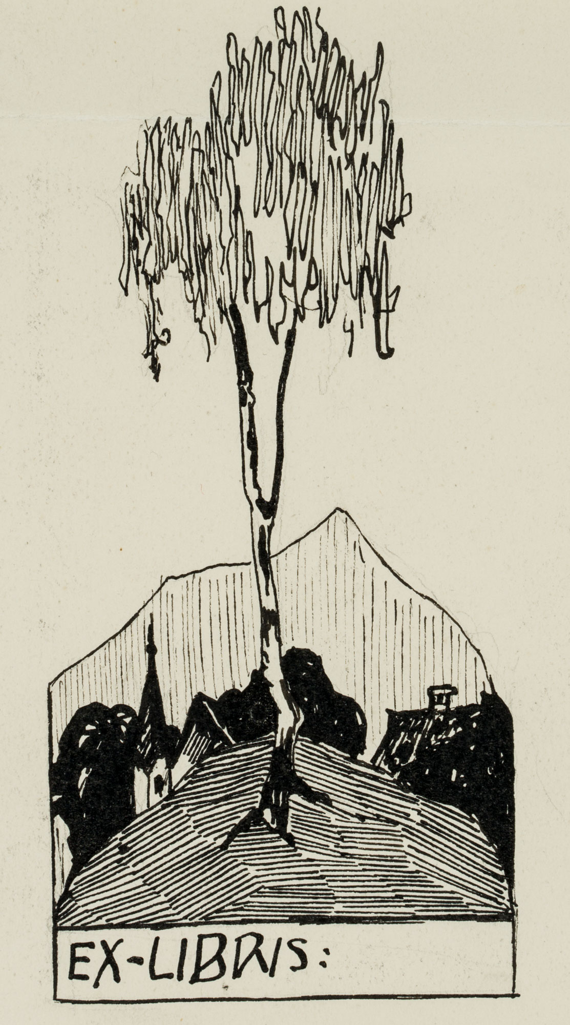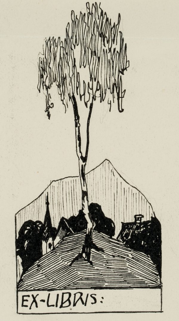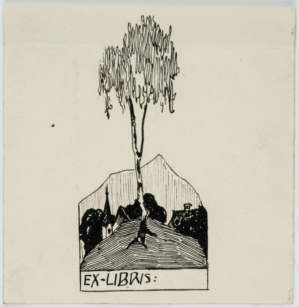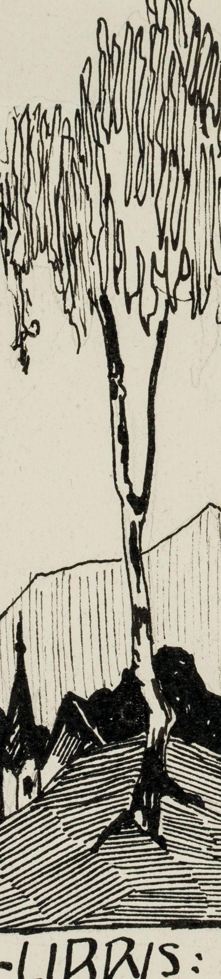 - Inscription: Inscribed below the image: “EX-LIBRIS:”. The “Exlibris” (from Latin “from the books of…”) drawn in ink shows a birch tree on a small hill, in the background a landscape with a church and a house.