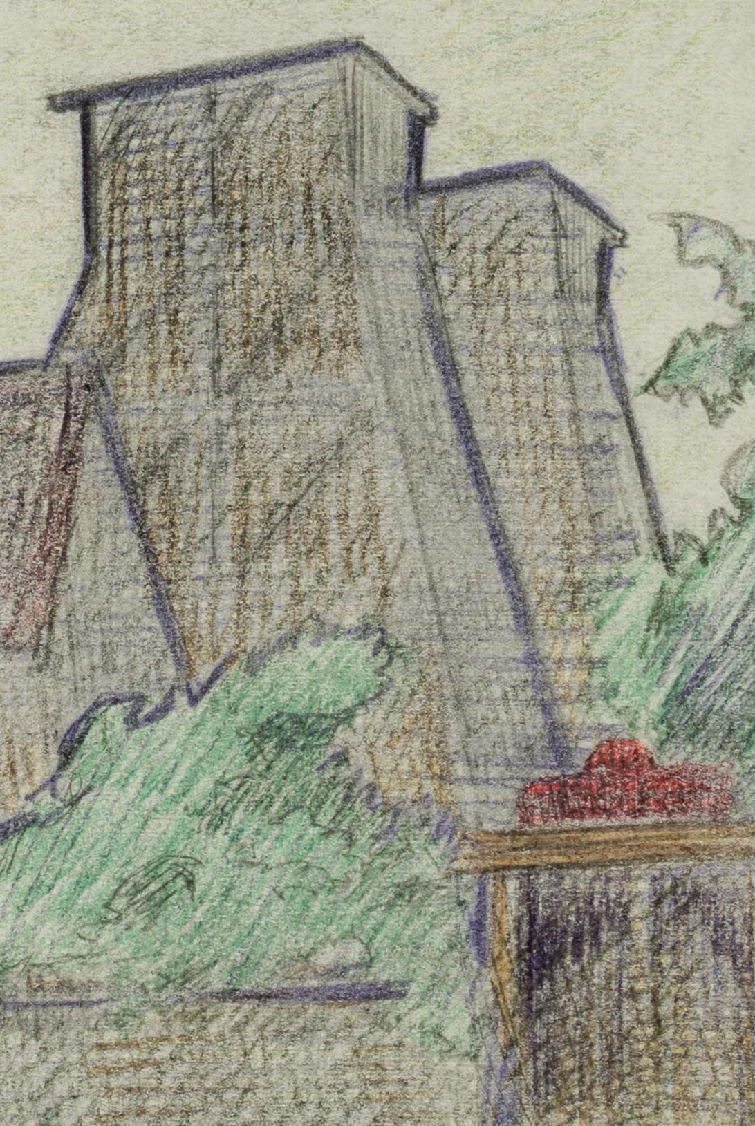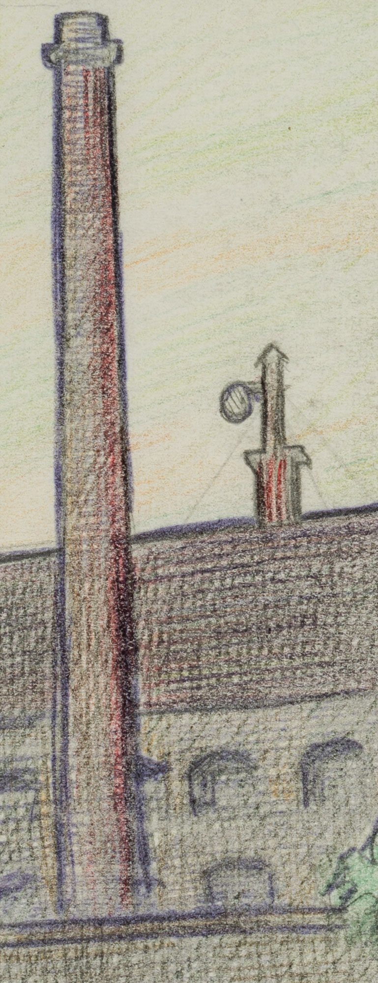Bruno Burger (1892 – 1968 ), “Feierabend”, Ansicht einer Fabrikanlage, , Buntstift