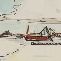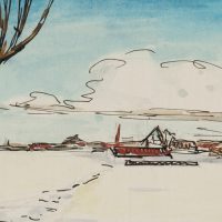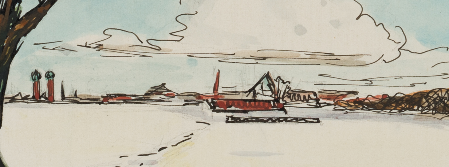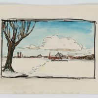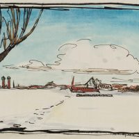 Bruno Burger (1892 – 1968 ), Flat snowy landscape with settlement in the distance, , Pen drawing