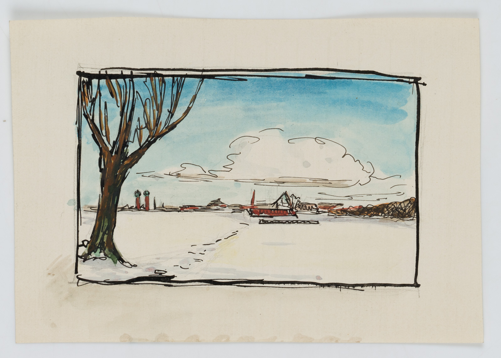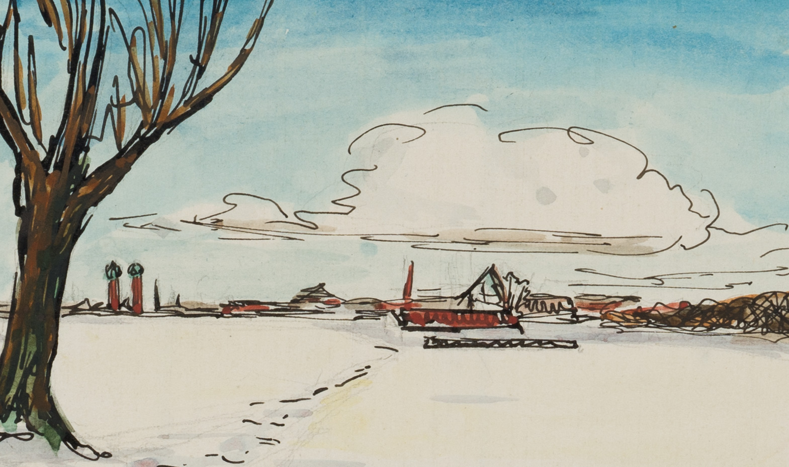 Bruno Burger (1892 – 1968 ), Flache Schneelandschaft mit Siedlung in der Ferne, , Federzeichnung