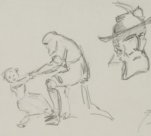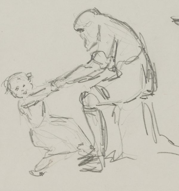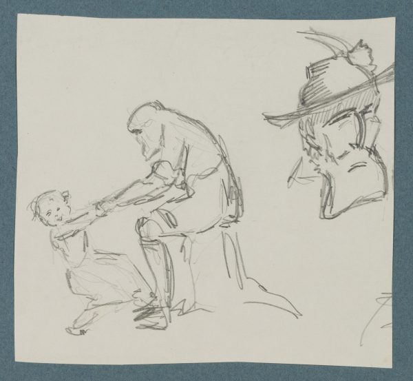 Bruno Burger (1892 – 1968 ), Großvater spielend mit kleiner Enkeltochter. Daneben Porträtskizze eines alten Mannes mit Hut, , Bleistift