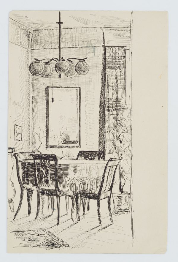 - Description: Detailed ink drawing with a view into a bourgeois interior of the 1920s/1930s.