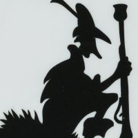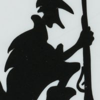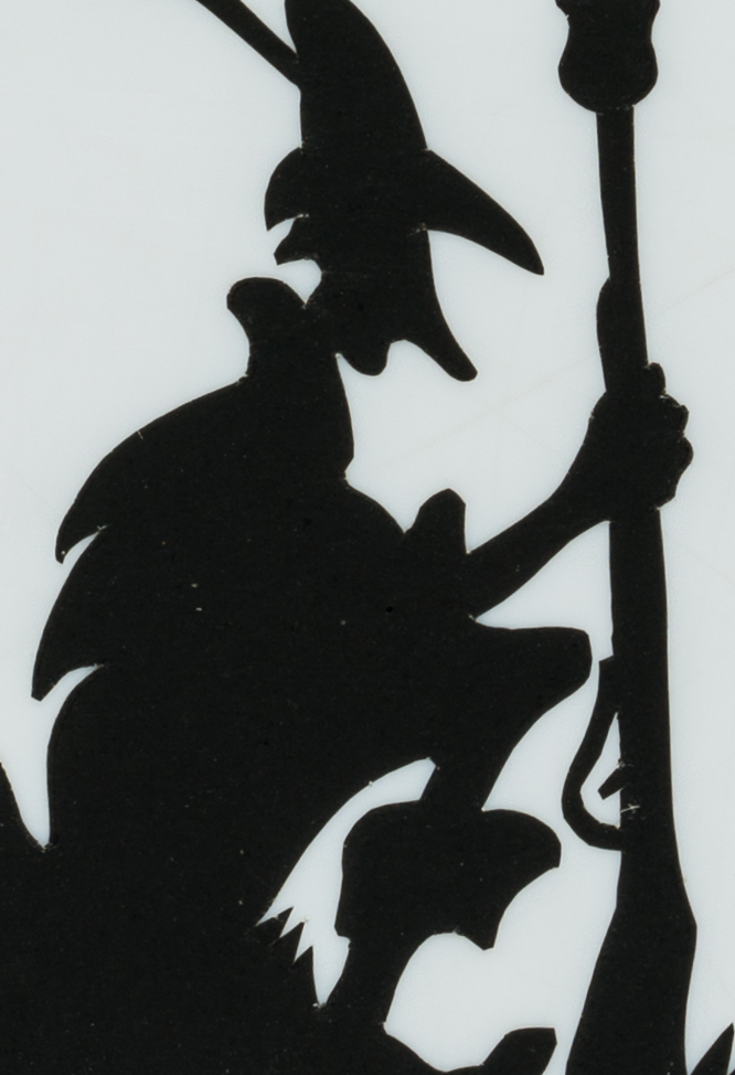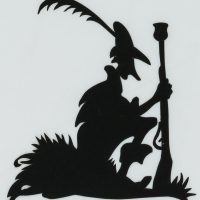 - Description: Silhouette with scalpel work in black paper on one side. Very finely worked. Showing a hunter kneeling in tall grass with shotgun and hat.