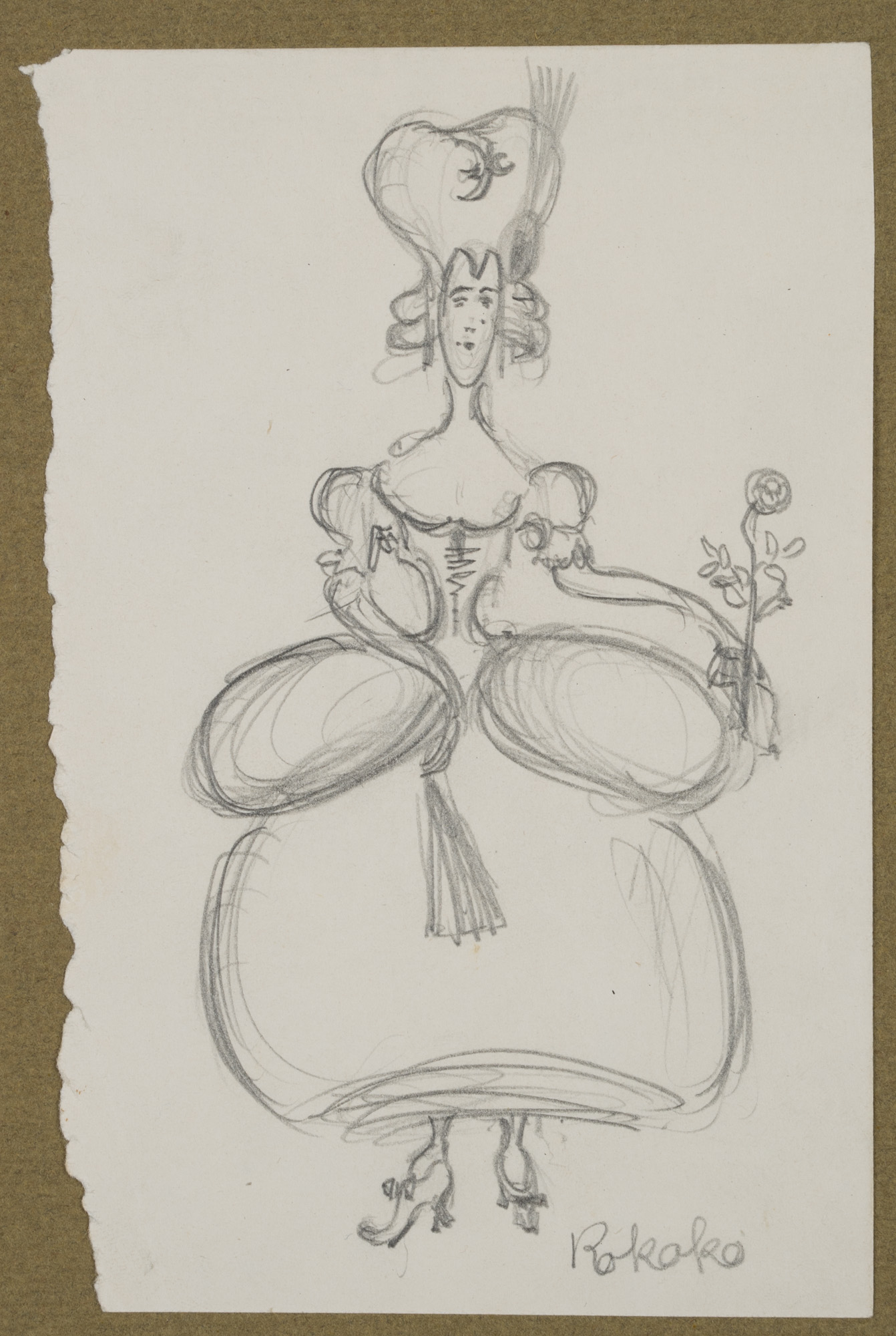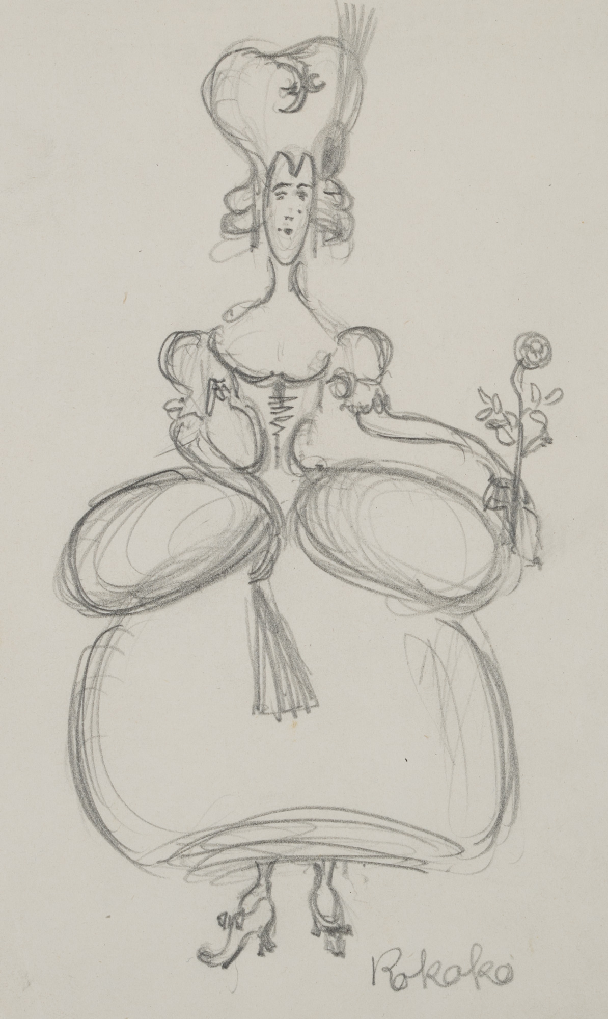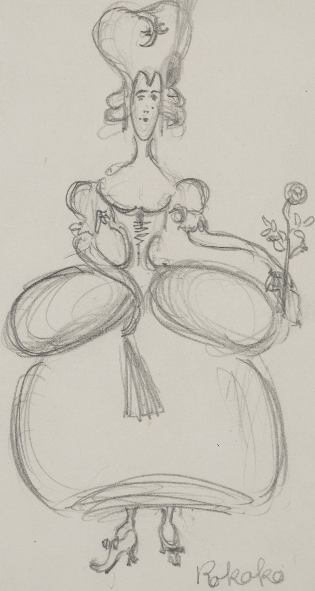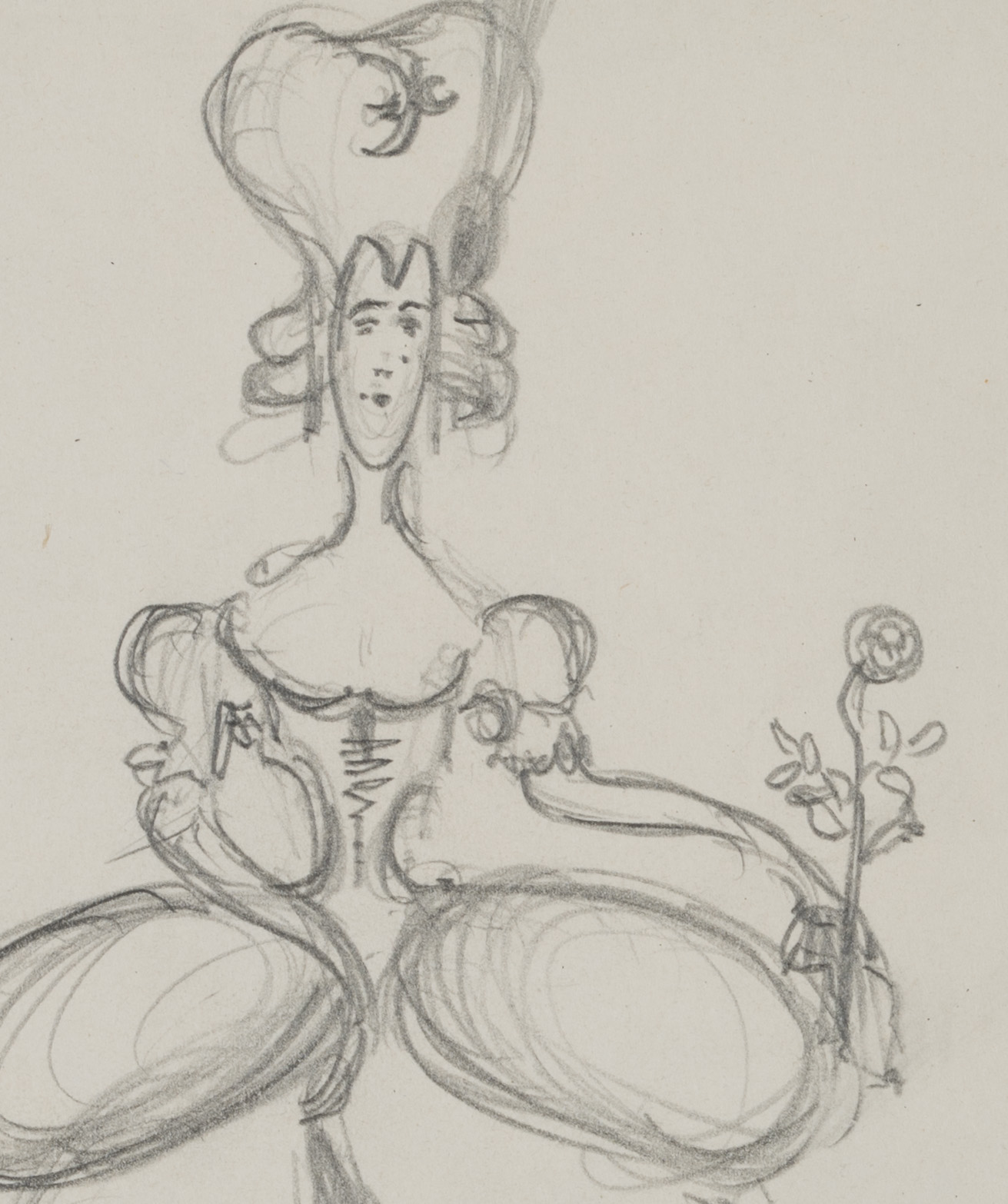 Bruno Burger (1892 – 1968 ), Caricature of Rococo Fashion with Portrait of a Lady in Full Figure, c. 1900, Pencil