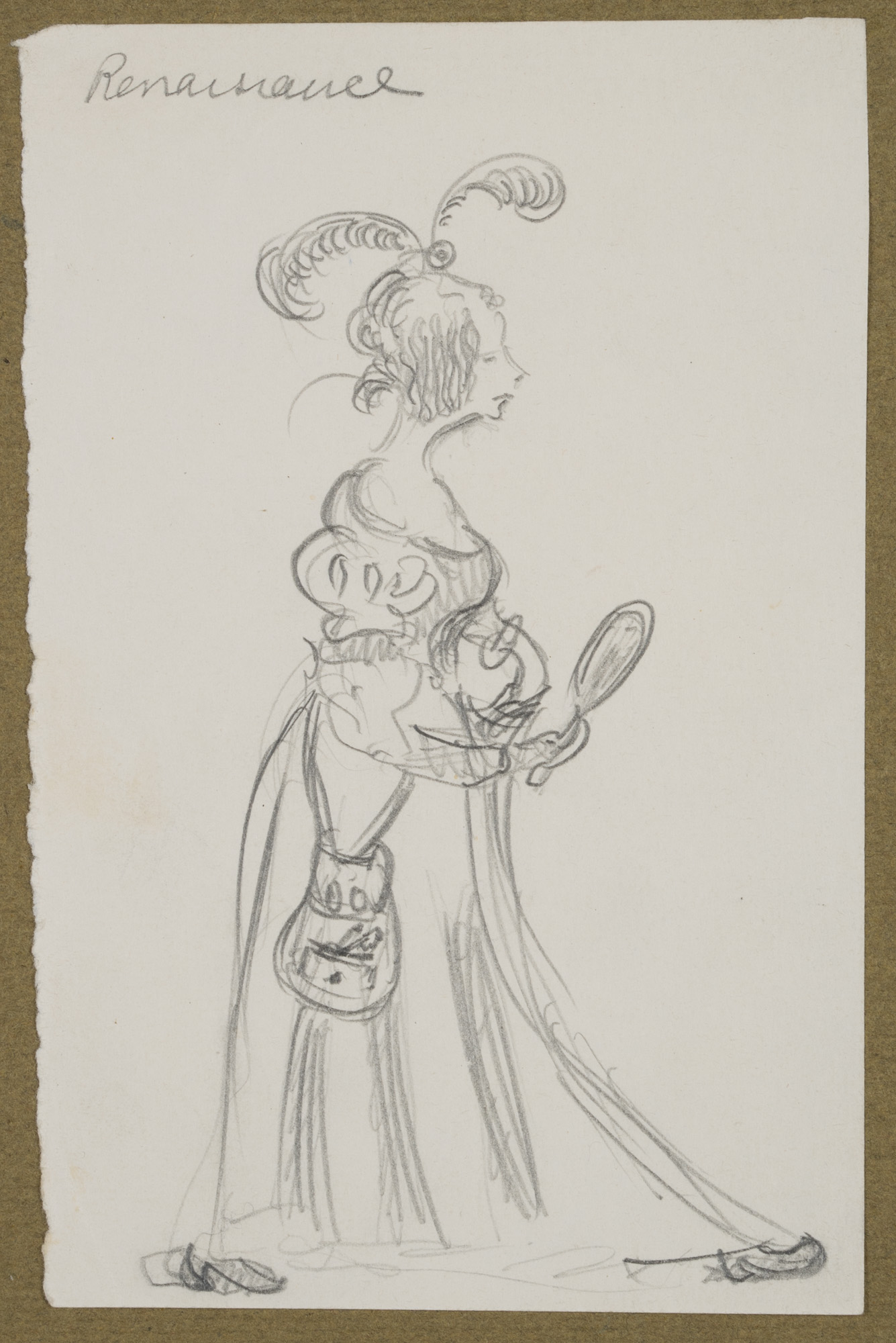 - Bezeichnung: Links oberhalb beschriftet mit “Renaissance”. Darunter das Bildnis einer Dame mit Spiegel in der Hand und verhältnismäßig lächerlich großen Federn im Haar. Das Blatt stammt aus einer Sammlung mit Zeichnungen von Bruno Burger. Beachten Sie dazu unser weiteres Angebot.