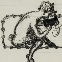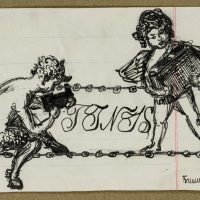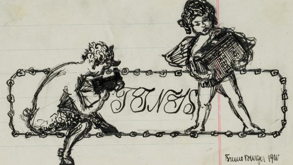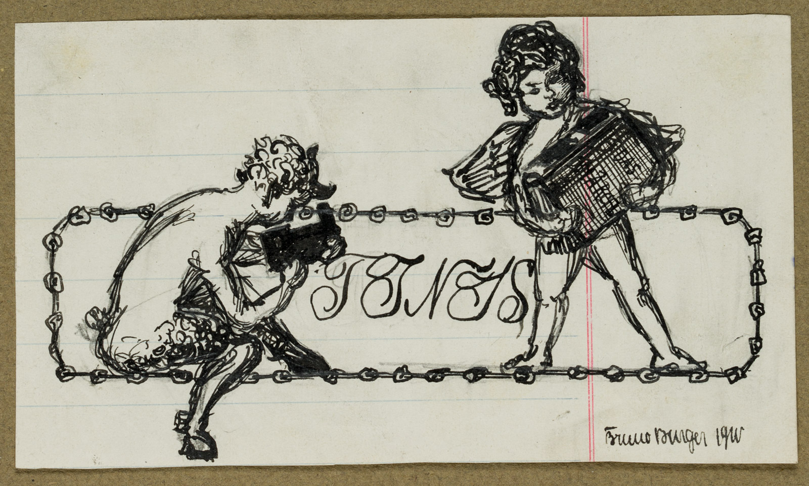 Bruno Burger (1892 – 1968 ), Pan making music with pan flute and putto with accordion, 1910, Indian ink