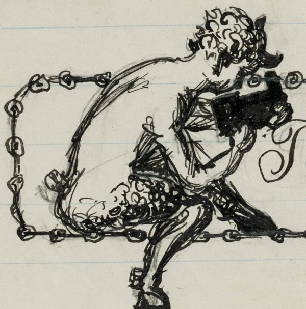 Ink drawing of a panpipe-playing pan with the lower body of a billy goat; to the right he is accompanied by a putto playing an accordion. The sheet comes from a collection folder with drawings by Bruno Burger. Please note our further offer. - Date: 1910