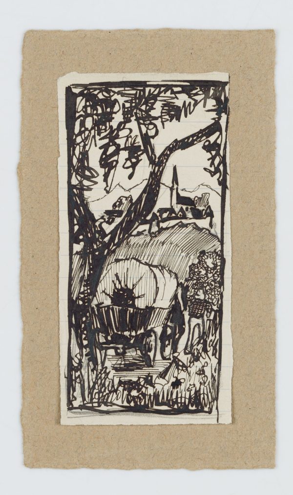 - Beschreibung: Tuschezeichnung eines Planwagens in einer Landschaft. Im Hintergrund ragt eine Siedlung mit Kirchturm auf einem Hügel hervor.