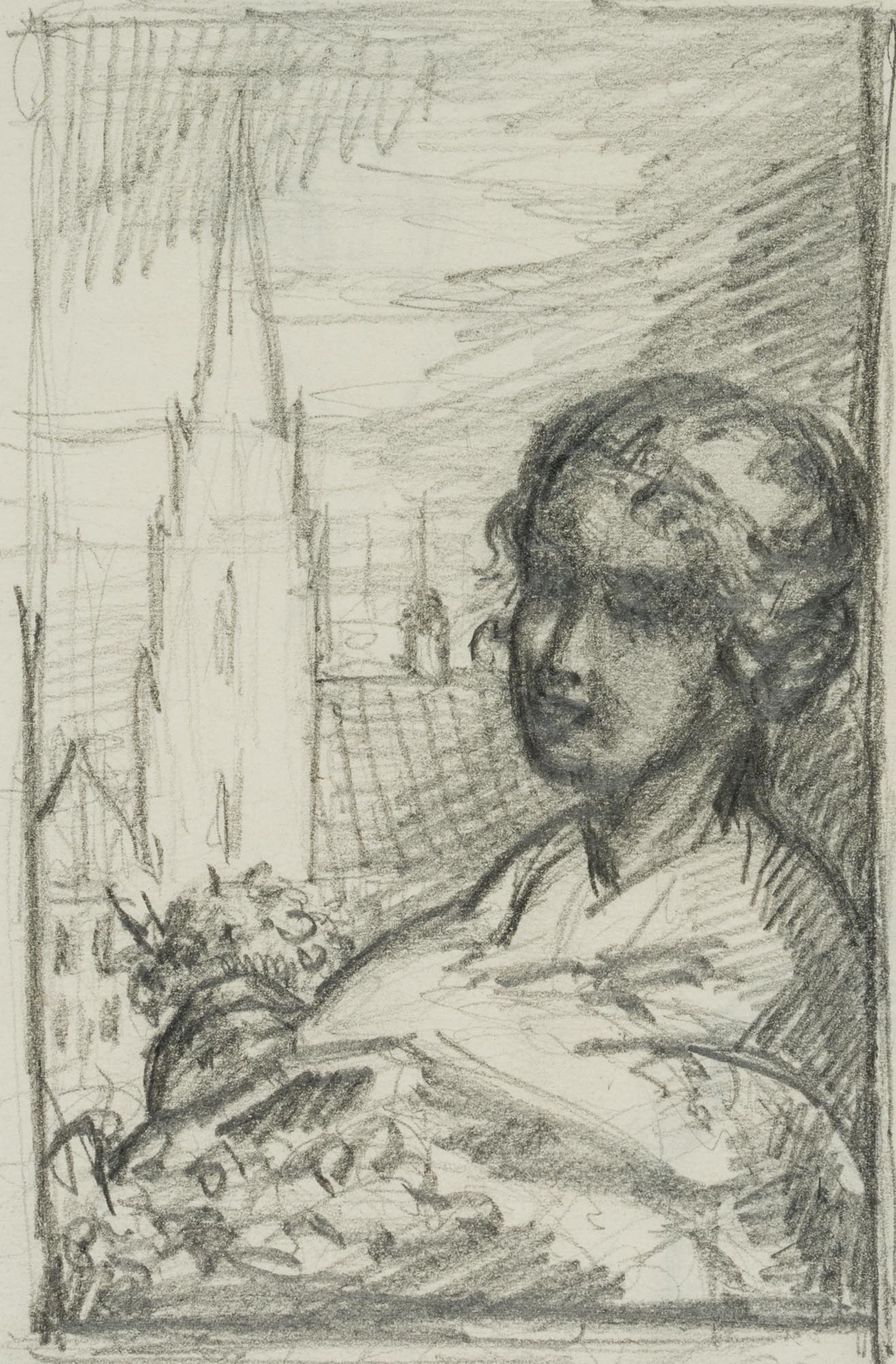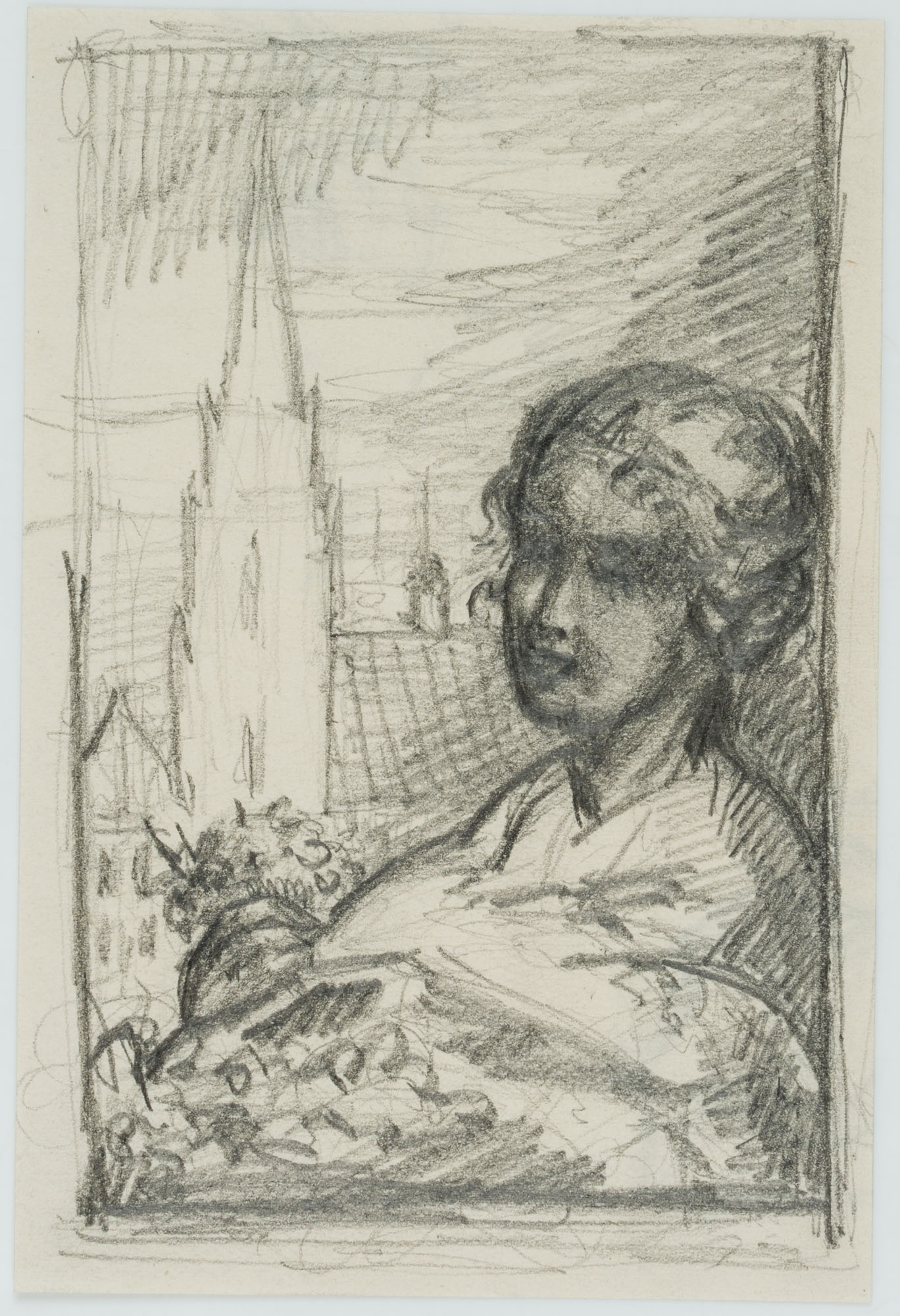 - Description: Portrait of a lady with flowers, a church can be seen in the background. From a collection folder with drawings by Bruno Burger. Please note our further offer.