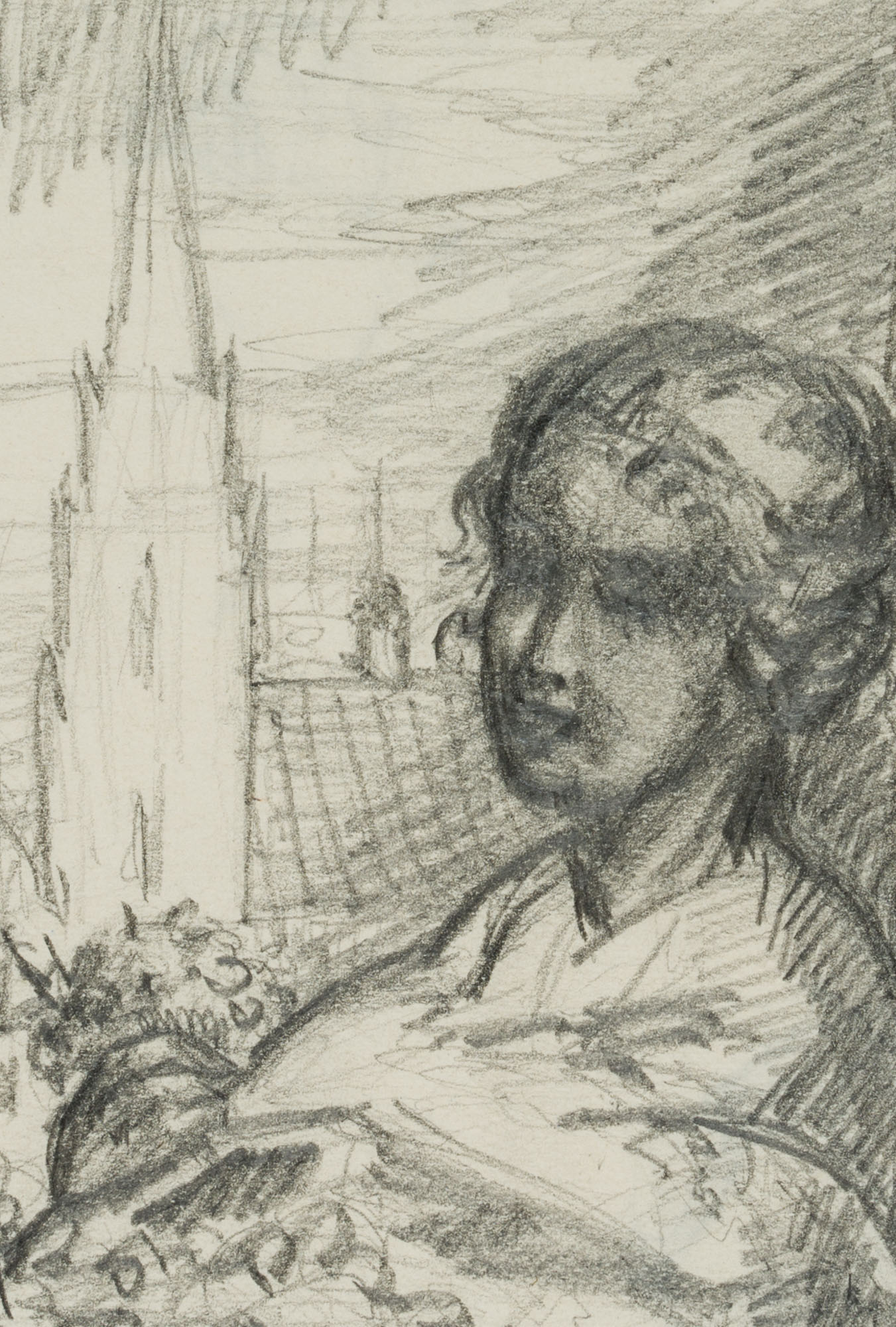 Bruno Burger (1892 – 1968 ), Porträt einer Dame mit Blumenstrauß und einer Kirche im Hintergrund, , Bleistift