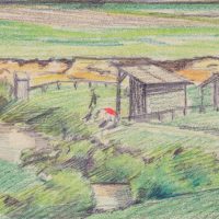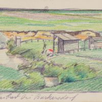 Bruno Burger (1892 – 1968 ), Freibad bei Burkersdorf. Blick über eine Flusslandschaft mit grünen Wiesen. Unbeschriebene Postkarte, , Buntstift