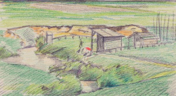 Bruno Burger (1892 – 1968 ), Outdoor pool near Burkersdorf View over a river landscape with green meadows Unwritten postcard, , Colored pencil