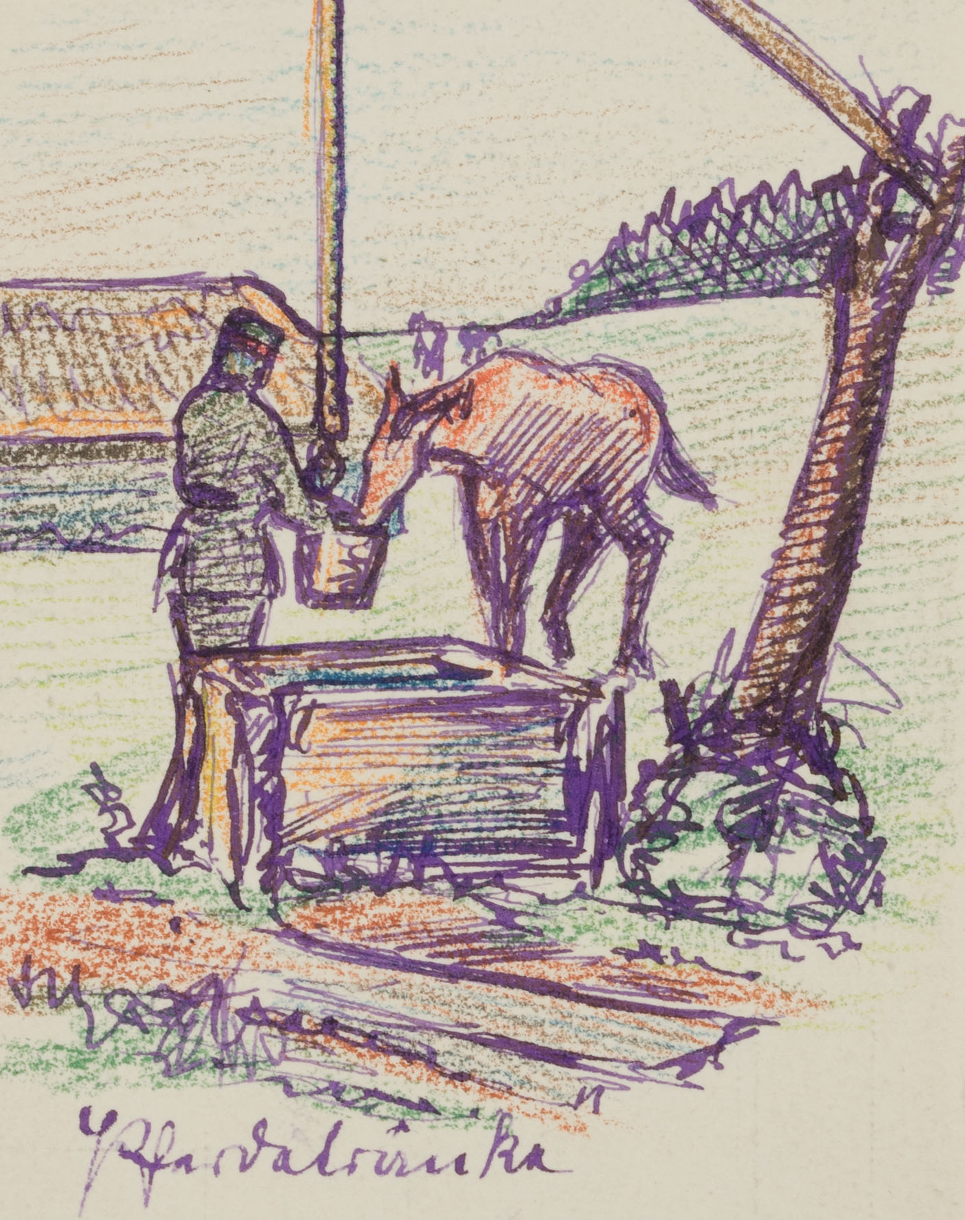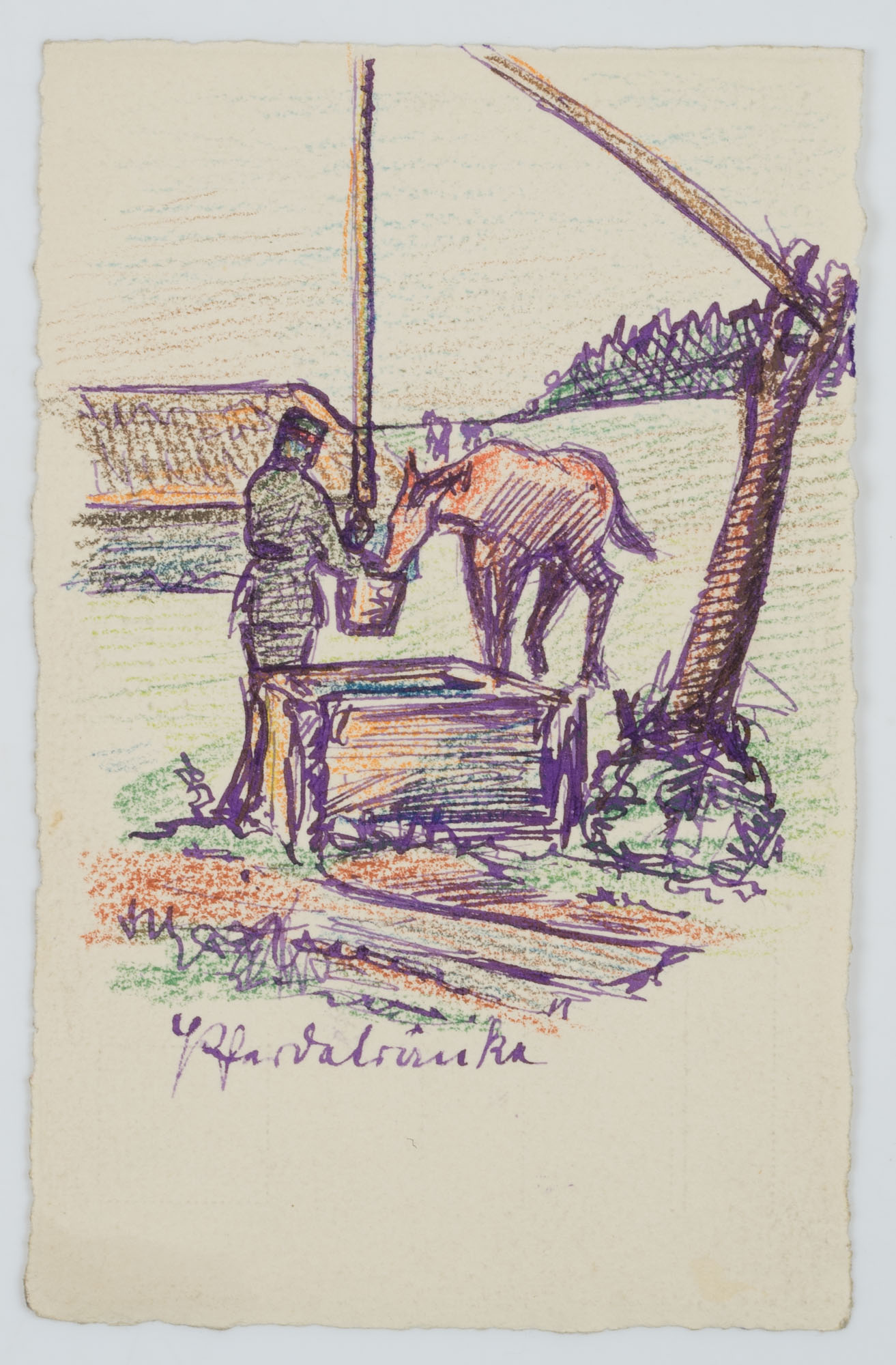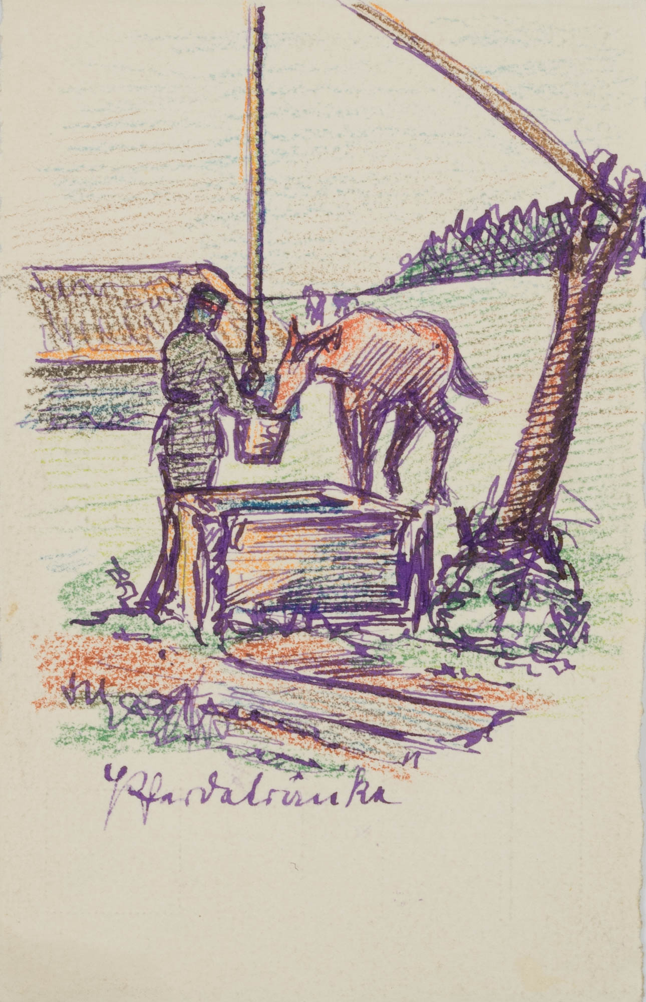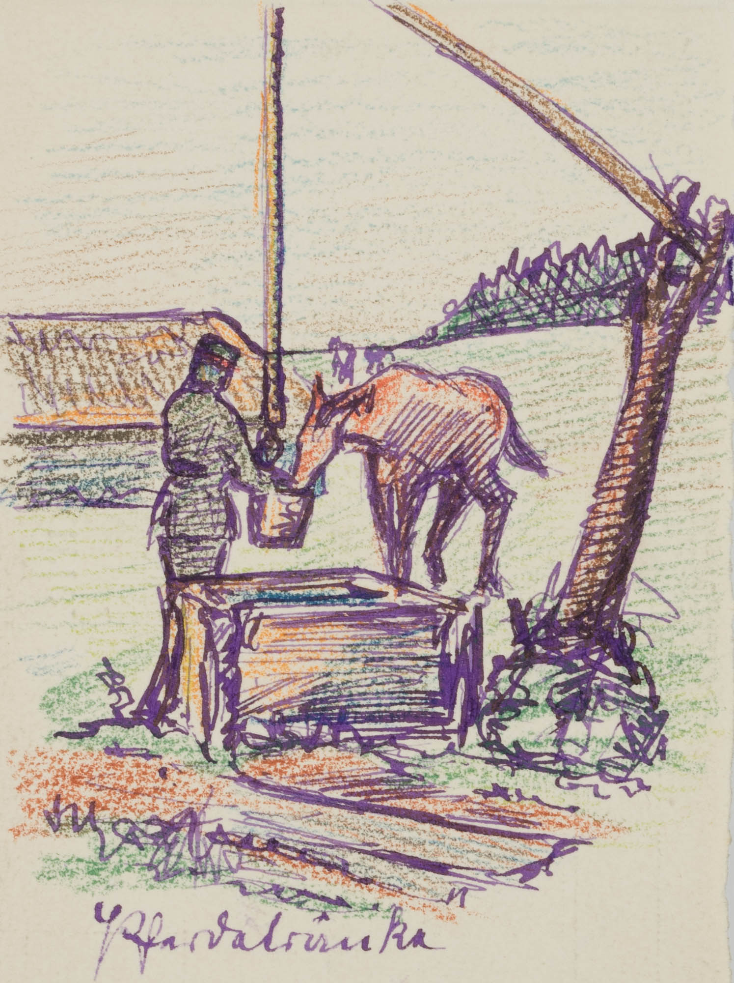 Bruno Burger (1892 – 1968 ), Postkarte, Pferdetränke mit einem Uniformierten, der sein Pferd versorgt, um 1916, Federzeichnung