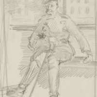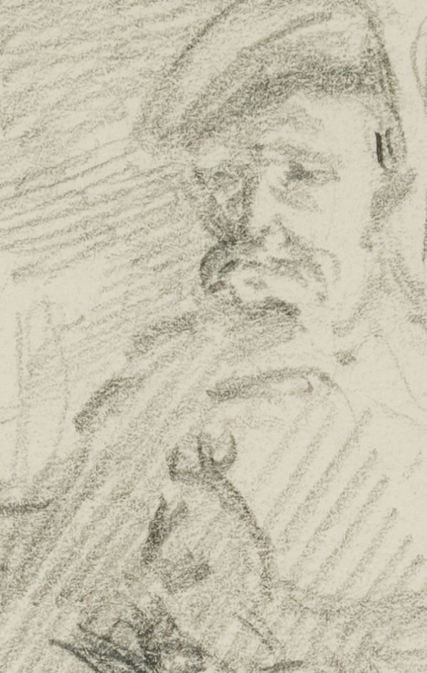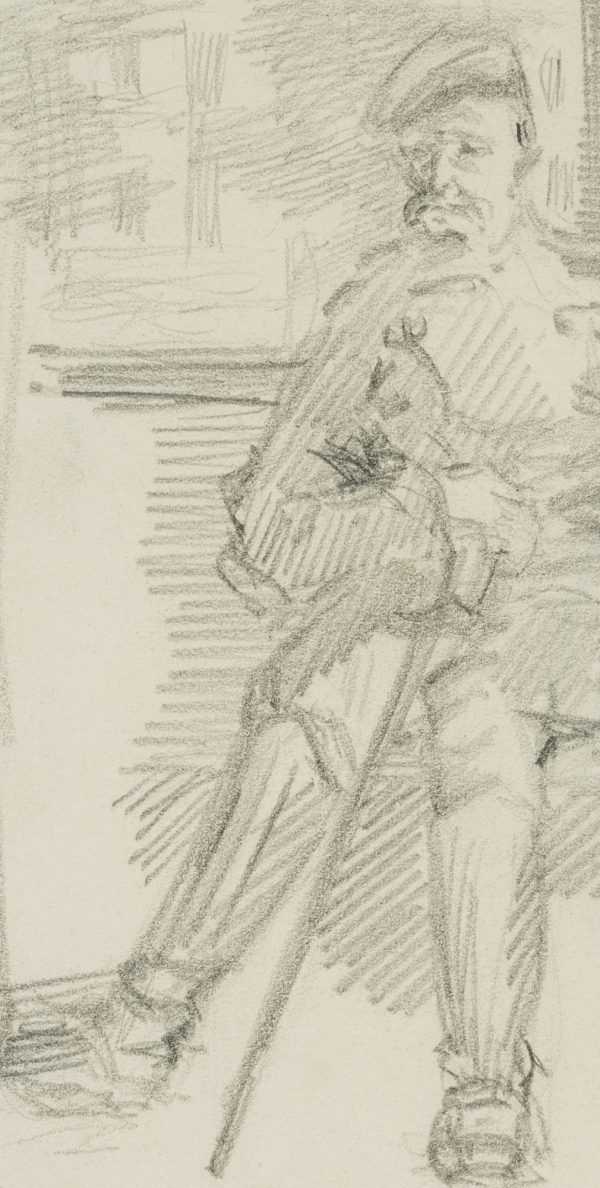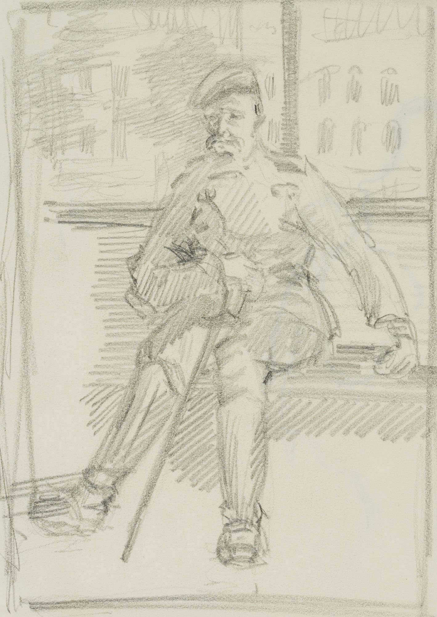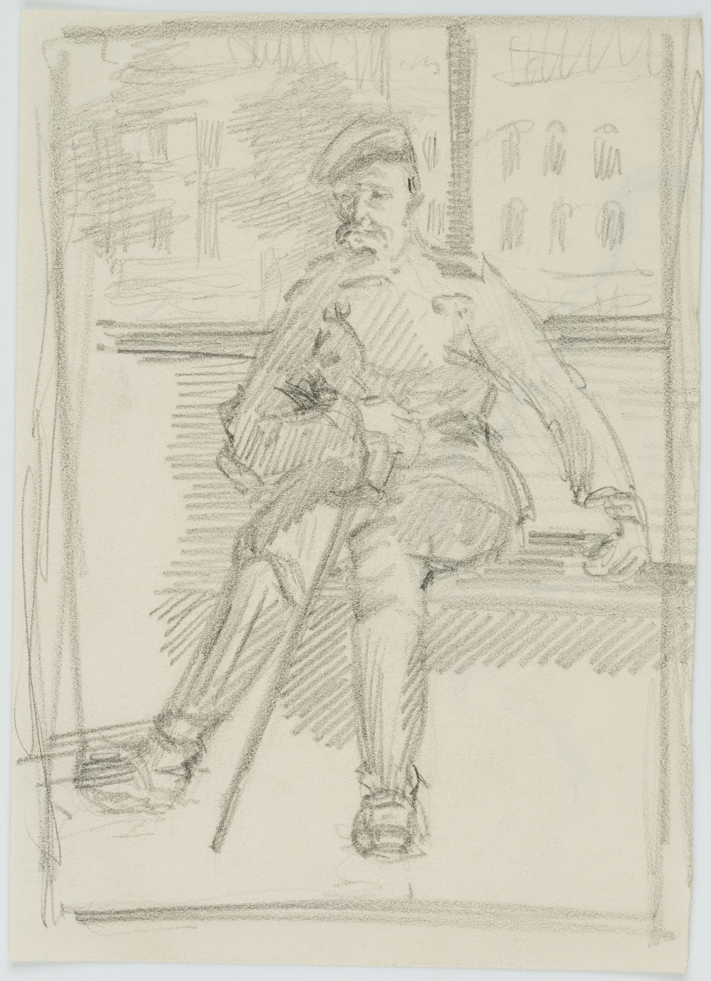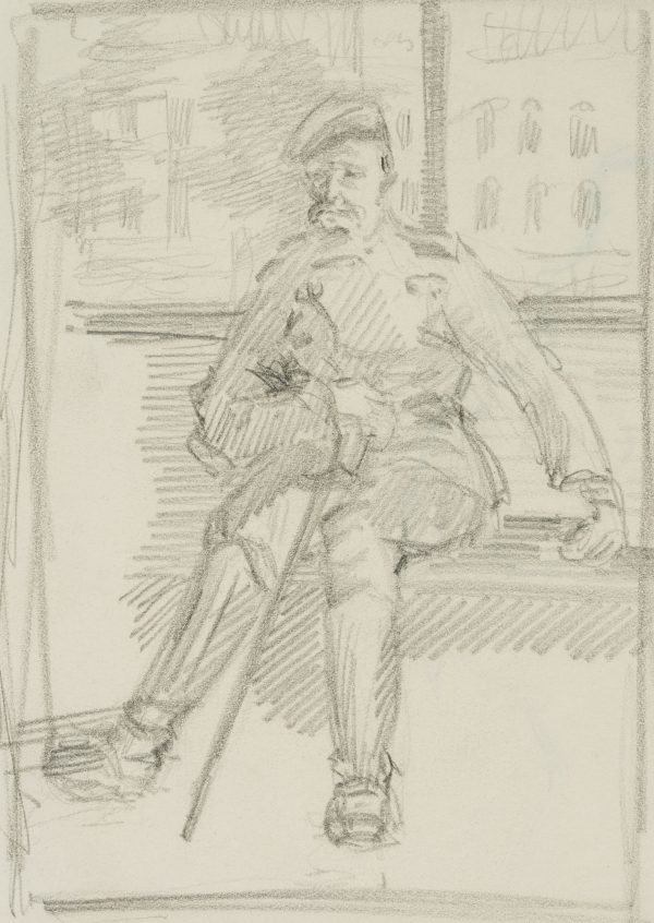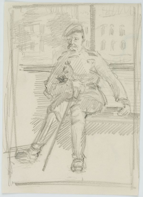 - Description: Full-length portrait of a seated man; his war injury forces him to carry a stick. Verso portrait of a lady in profile, eating an apple. From a collection folder with drawings by Bruno Burger. Please note our further offer.