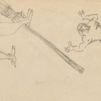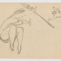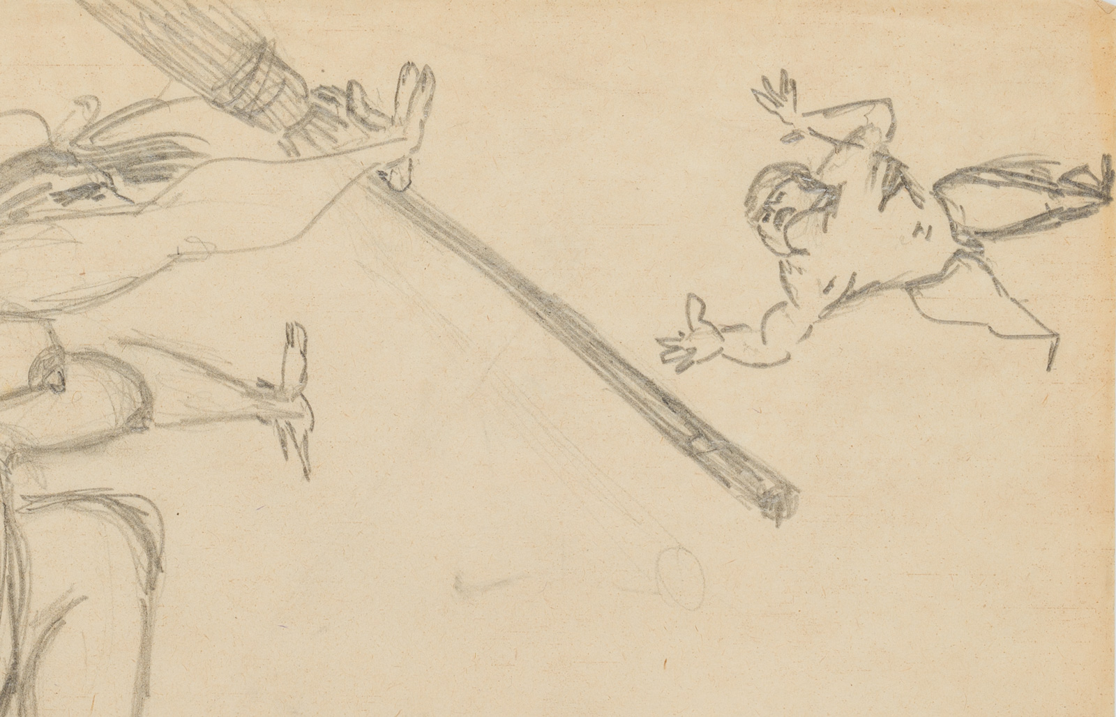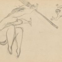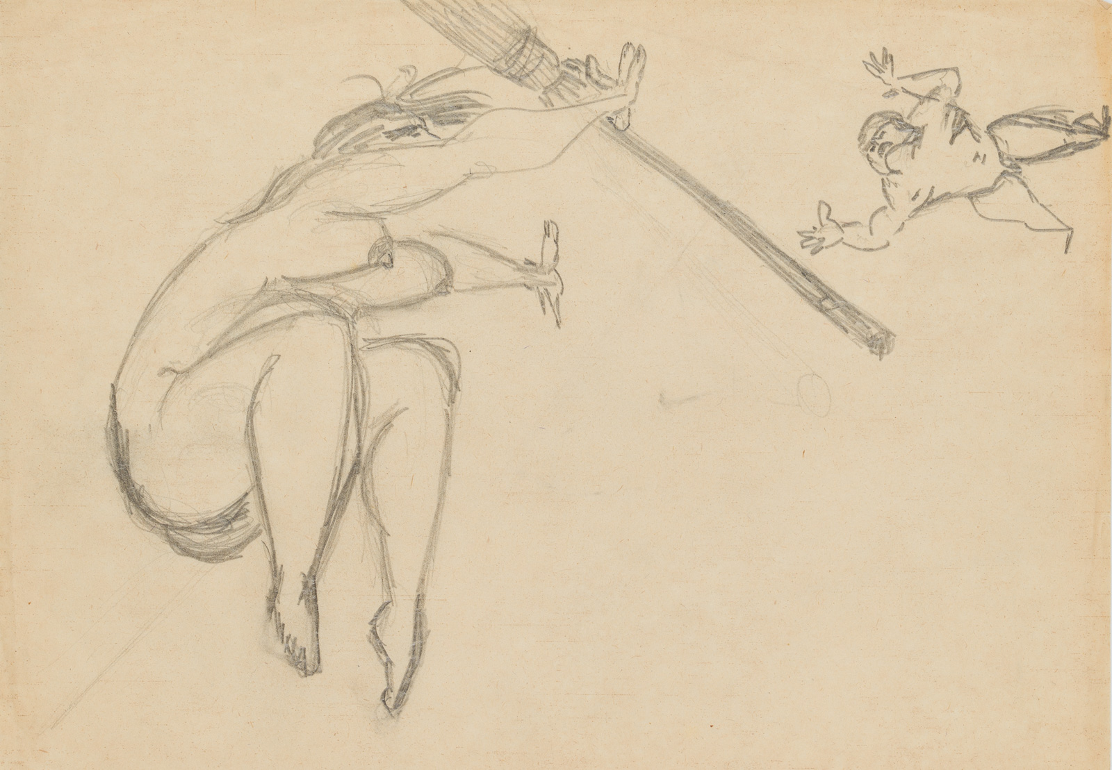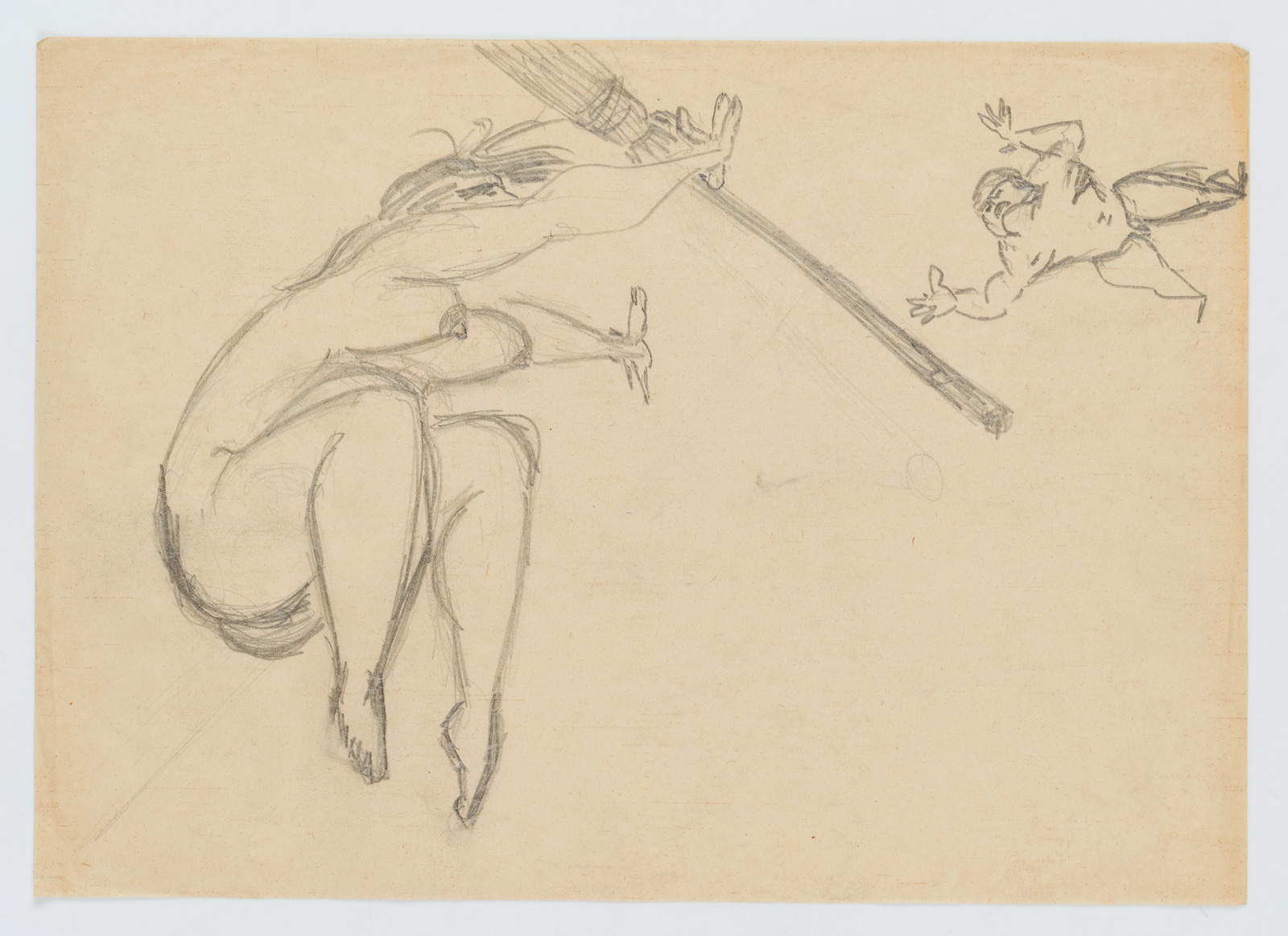 • Description: Pencil study of an unclothed woman in free fall with her broom. A male nude figure has raised his hands to catch her.