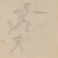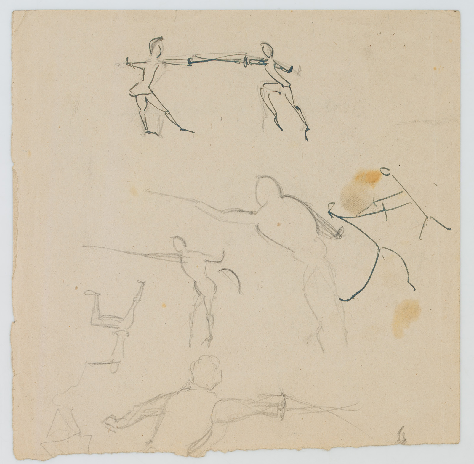 Bruno Burger (1892 – 1968 ), Skizzen eines Jungen in Fechtstellung mit einem Degen in der rechten ausgestreckten Hand, , Bleistift
