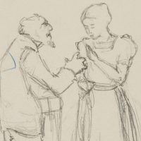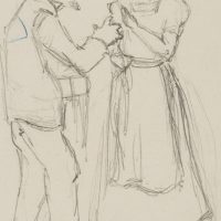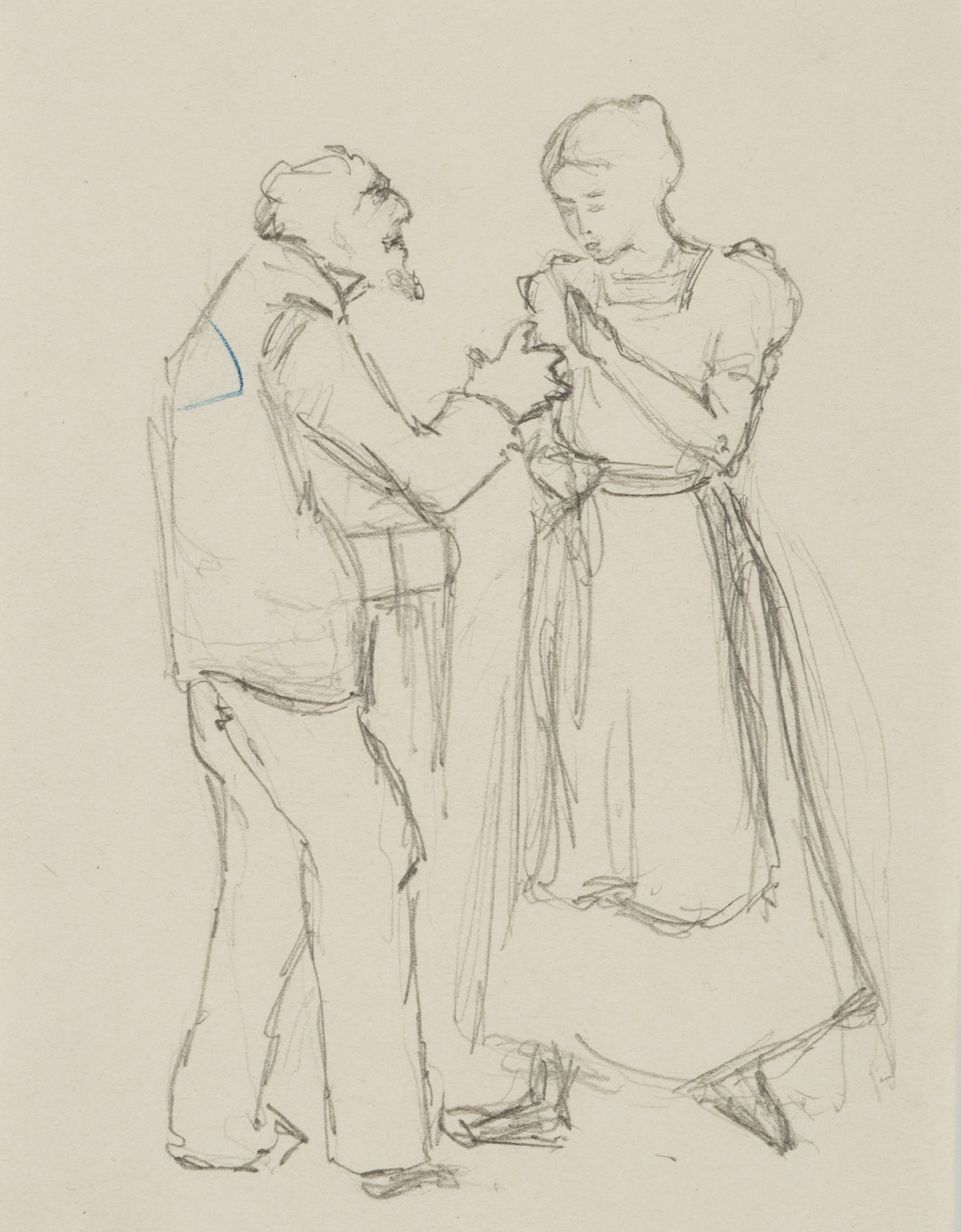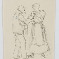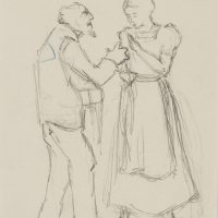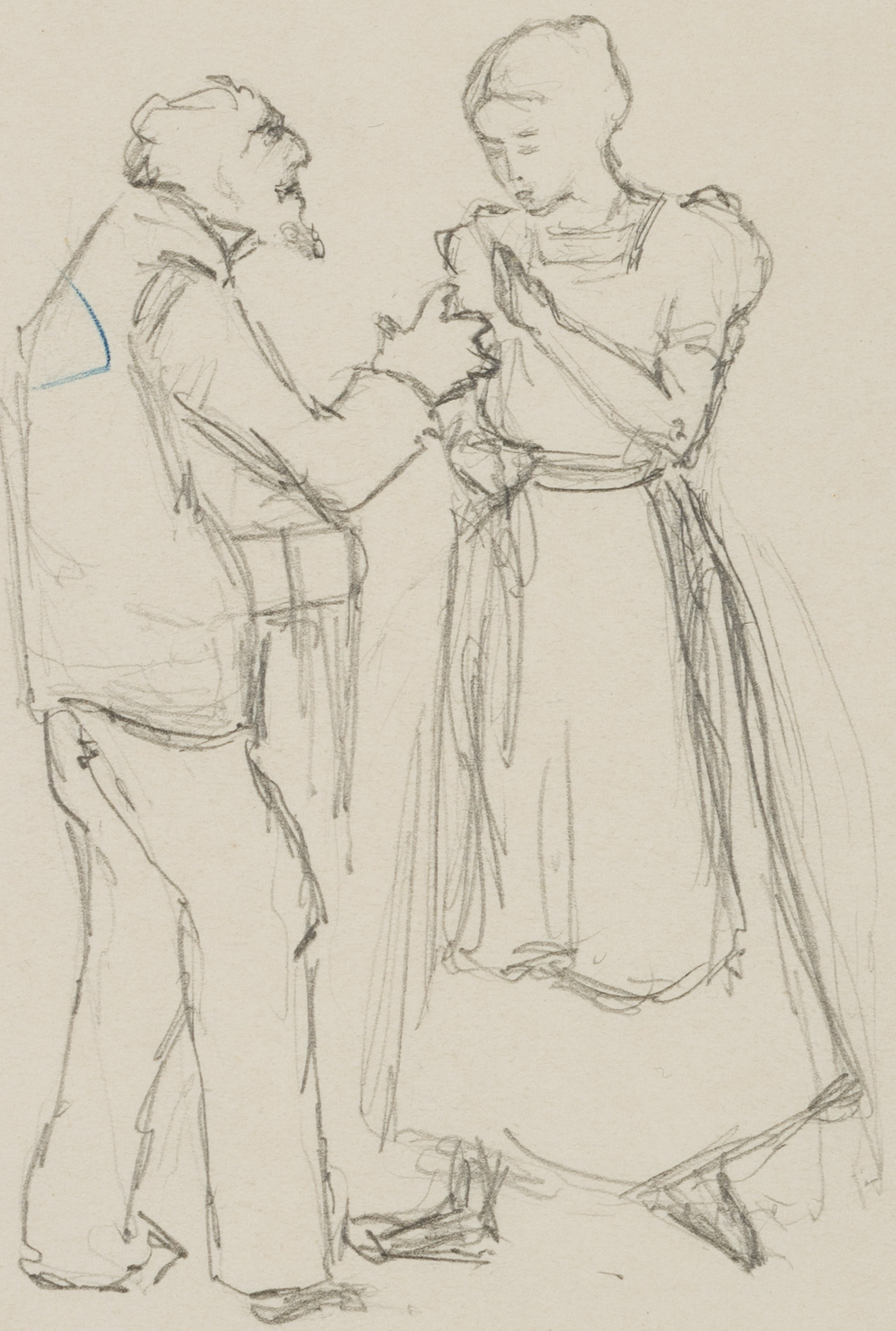- Description: A soldier is talking to a young maid. He has doffed his hat to her and holds out his hand. She has tilted her head down. It seems as if the soldier is delivering sad news. From a collection folder with drawings by Bruno Burger. Please note our further offer.