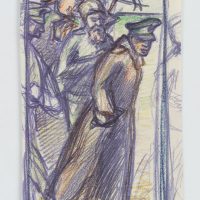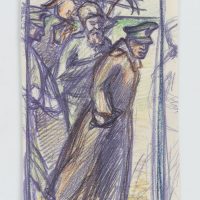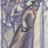 - Description: Coloured pencil drawing of an officer in a coat and ulcerated soldiers.