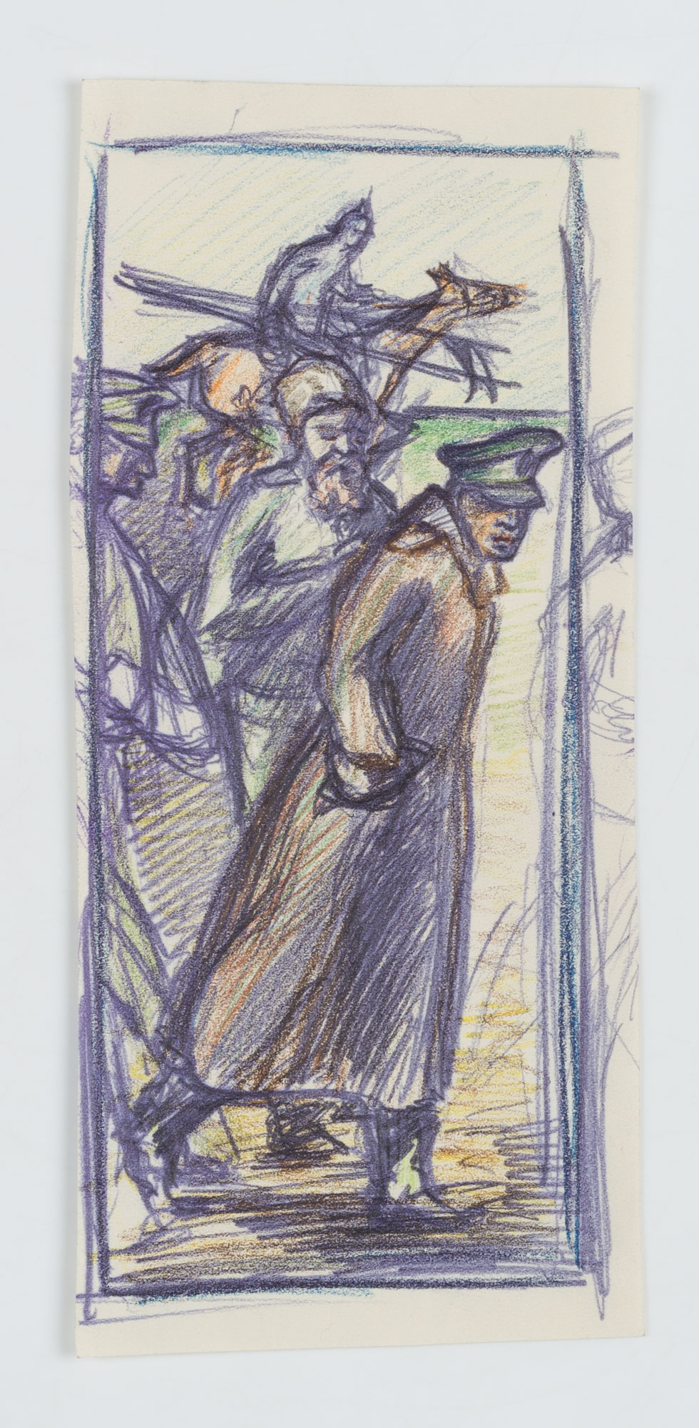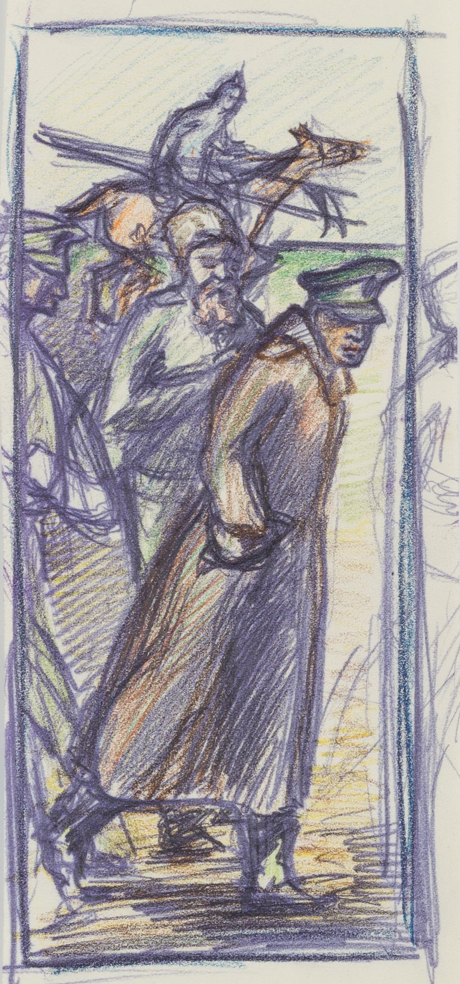 - Beschreibung: Buntstiftzeichnung eines Offiziers im Mantel und weiteren Soldaten.