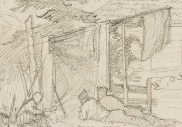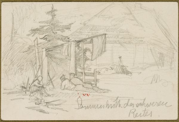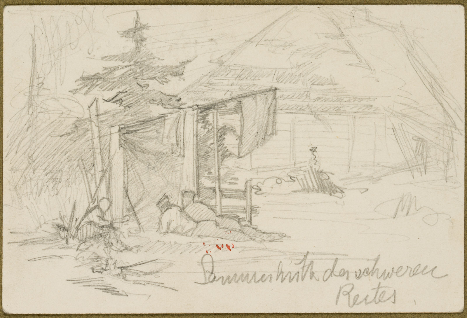 Bruno Burger (1892 – 1968 ), “Sommerhütte der schweren Reiter”. Hütte im Wald mit Soldaten, 1915, Bleistift