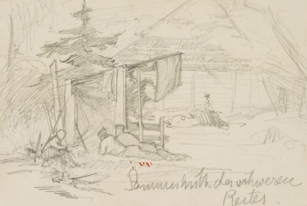 Bruno Burger (1892 – 1968 ), “Summer hut of the heavy riders” Hut in the forest with soldiers, 1915, Pencil