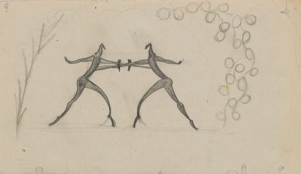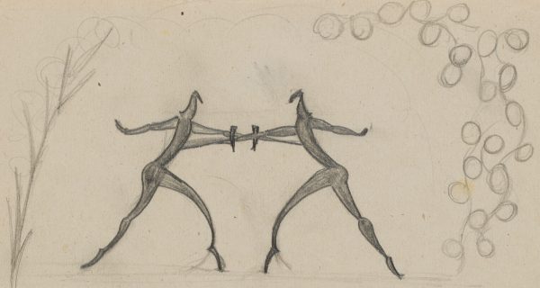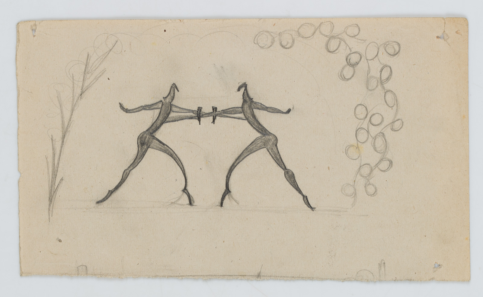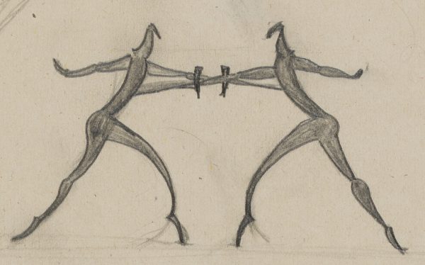 Bruno Burger (1892 – 1968 ), Szene eines Fechtkampfes auf einer Bühne mit graziösen Figuren, , Bleistift