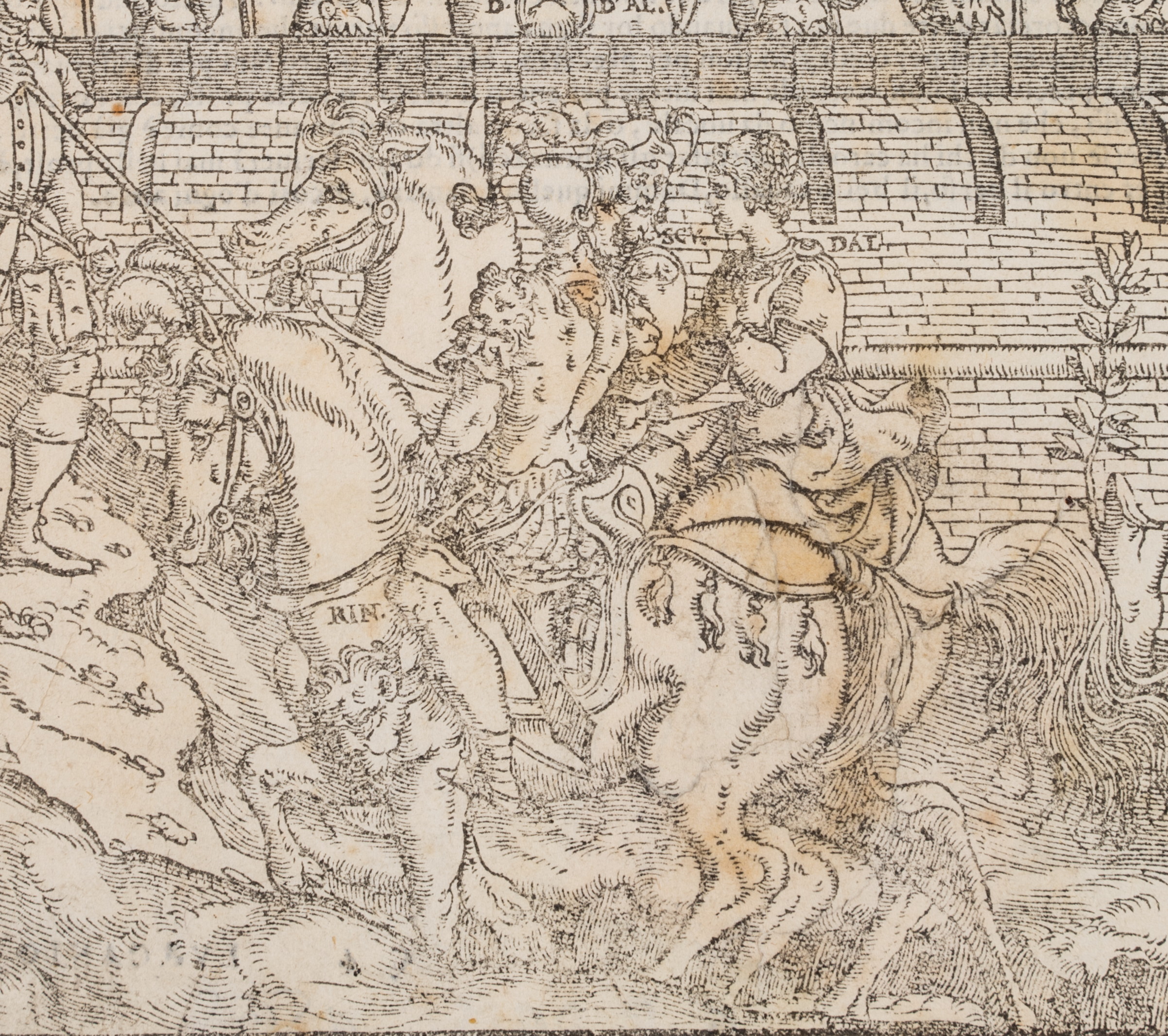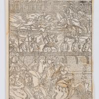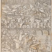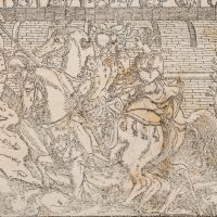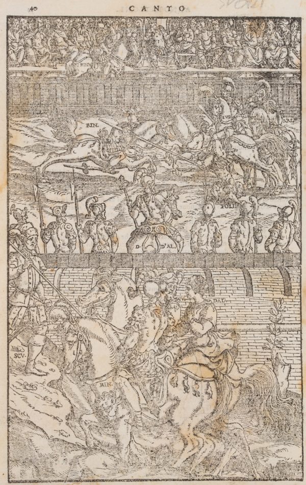 - Description: Beautiful depiction of a medieval tournament with jousting knights. Possibly illustration for Ludovico Ariosto’s (1474-1533) Orlando Furioso (The Raging Roland), which was first printed in Ferrara in 1516. Print without the characteristic decorative frame.