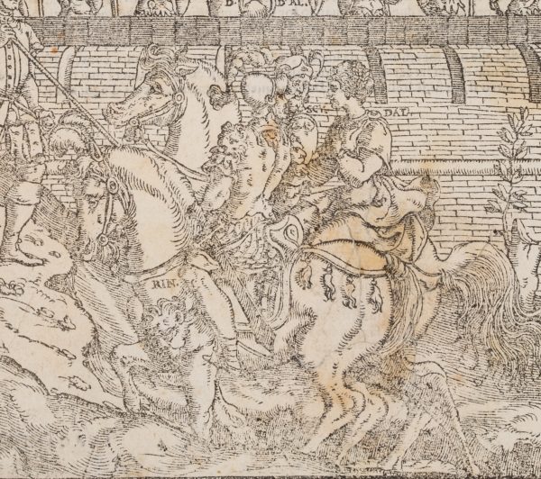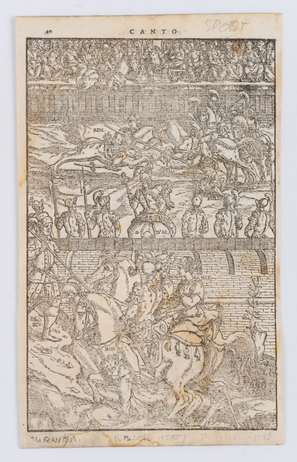 - Beschreibung: Schöne Darstellung eines mittelalterlichen Turniers mit tjostenden Rittern. Möglicherweise Illustration zu Ludovico Ariostos (1474-1533) Orlando Furioso (Der rasende Roland), das erstmals 1516 in Ferrara gedruckt wurde. Abdruck ohne den charakteristischen Schmuckrahmen.
