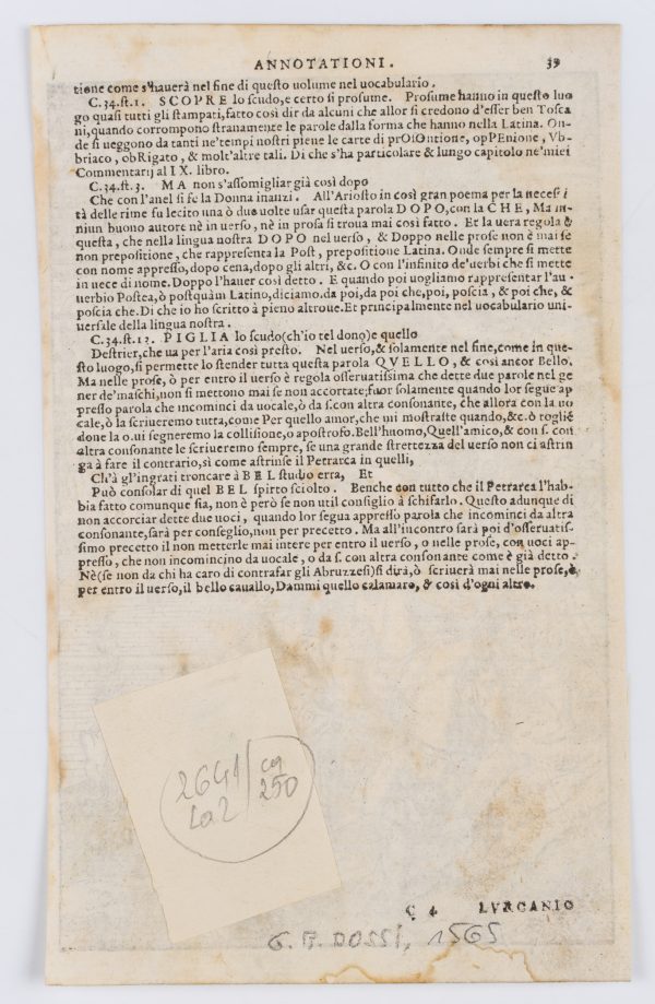 - Verso: Typographical print in Italian “Annotationi