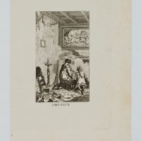 - Description: View of an interior in which two kneeling figures light a fire with a bellows.