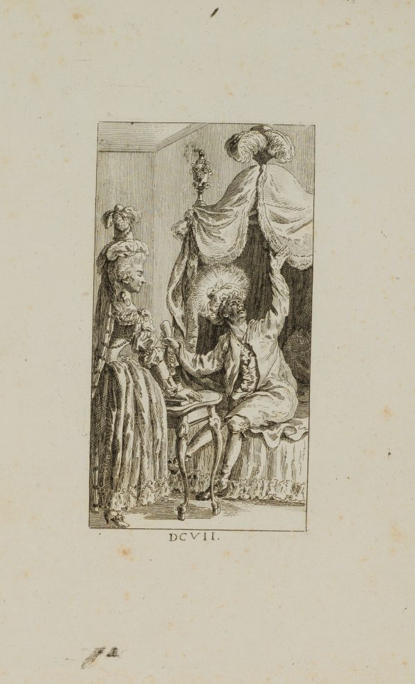 - Description: Depiction of a court lady in rococo costume in front of a gentleman with a nimbus sitting on a bed with Baldchin. He holds a scroll and points upwards.