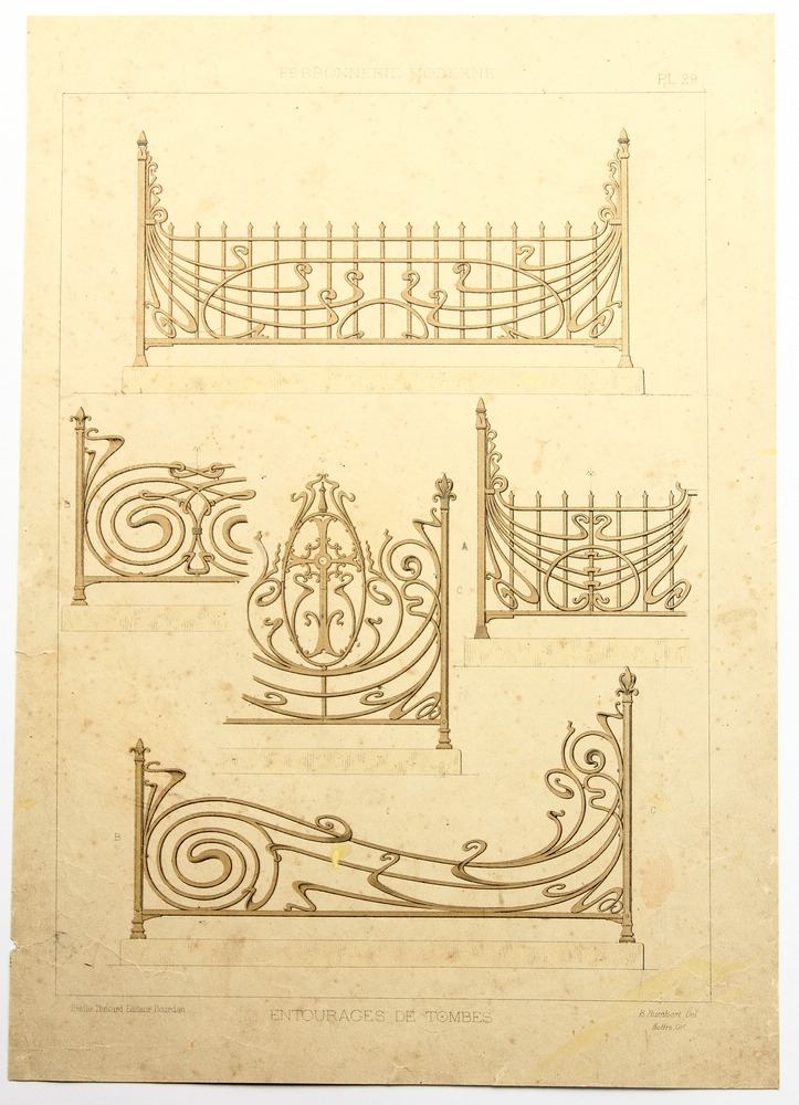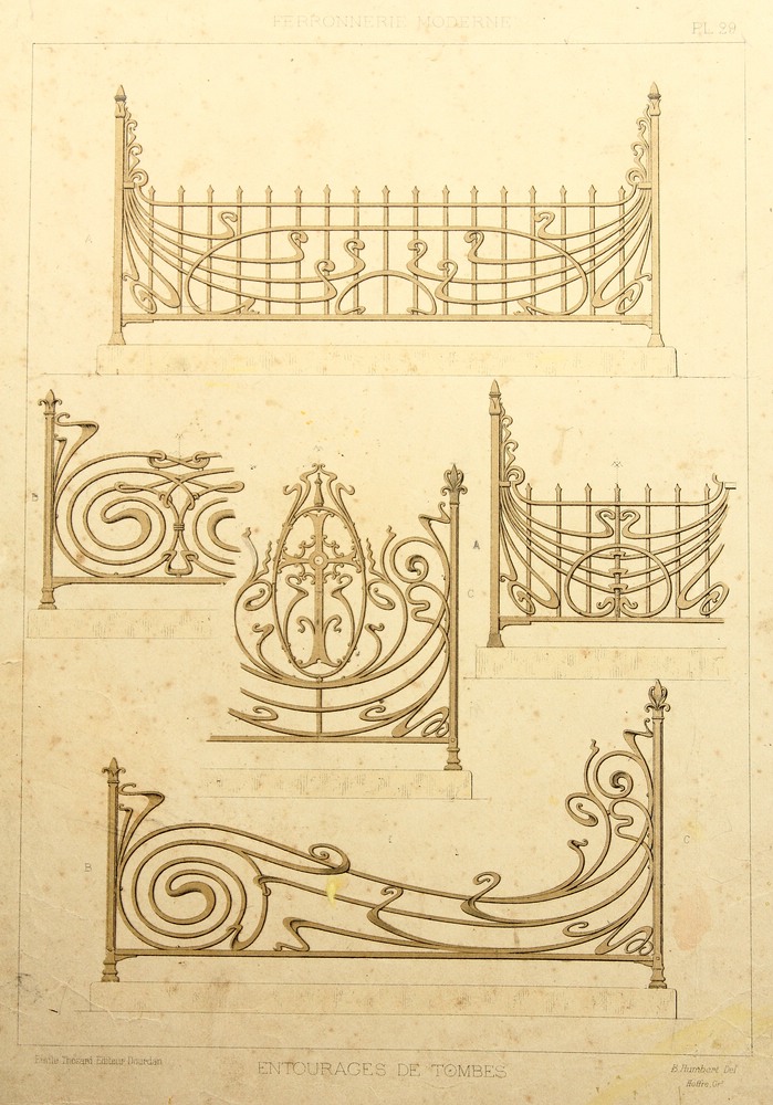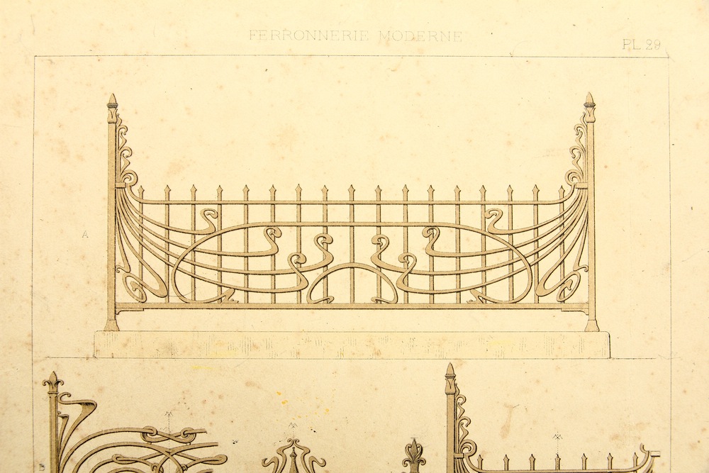 - Description: Coloured lithograph on strong paper. The sheet comes from the collective work Ferronnerie Moderne par B.Humbert Dessinateur-spcial de Serrurerie – Librairie Spciale d’architecture Medaille d’Or l’Exposition Universelle de Paris 1900, published by Emile Thzard Fils, Dourdan (Seine-et-oise).Various designs for tasteful, sometimes extravagant artistic ironwork can be seen in full view or in detail, some of which correspond to Art Nouveau design.