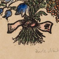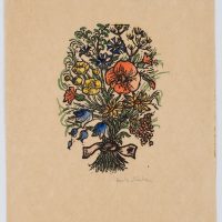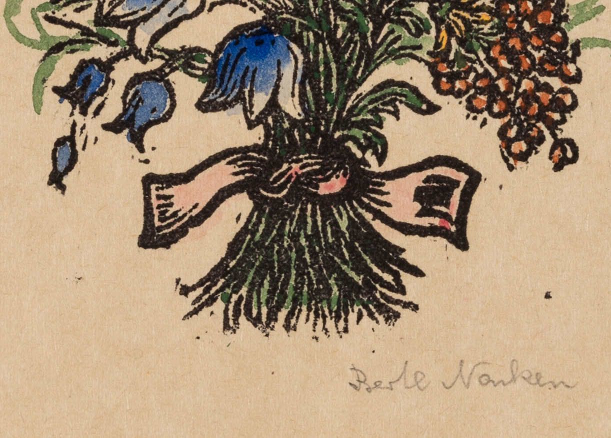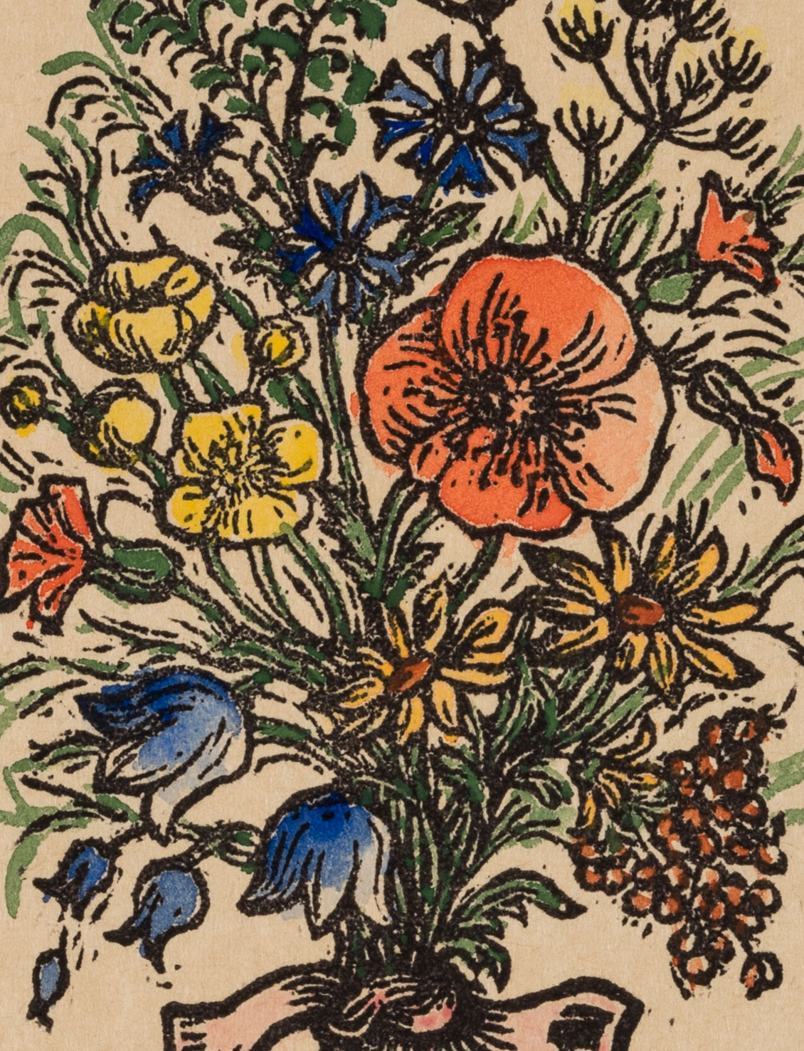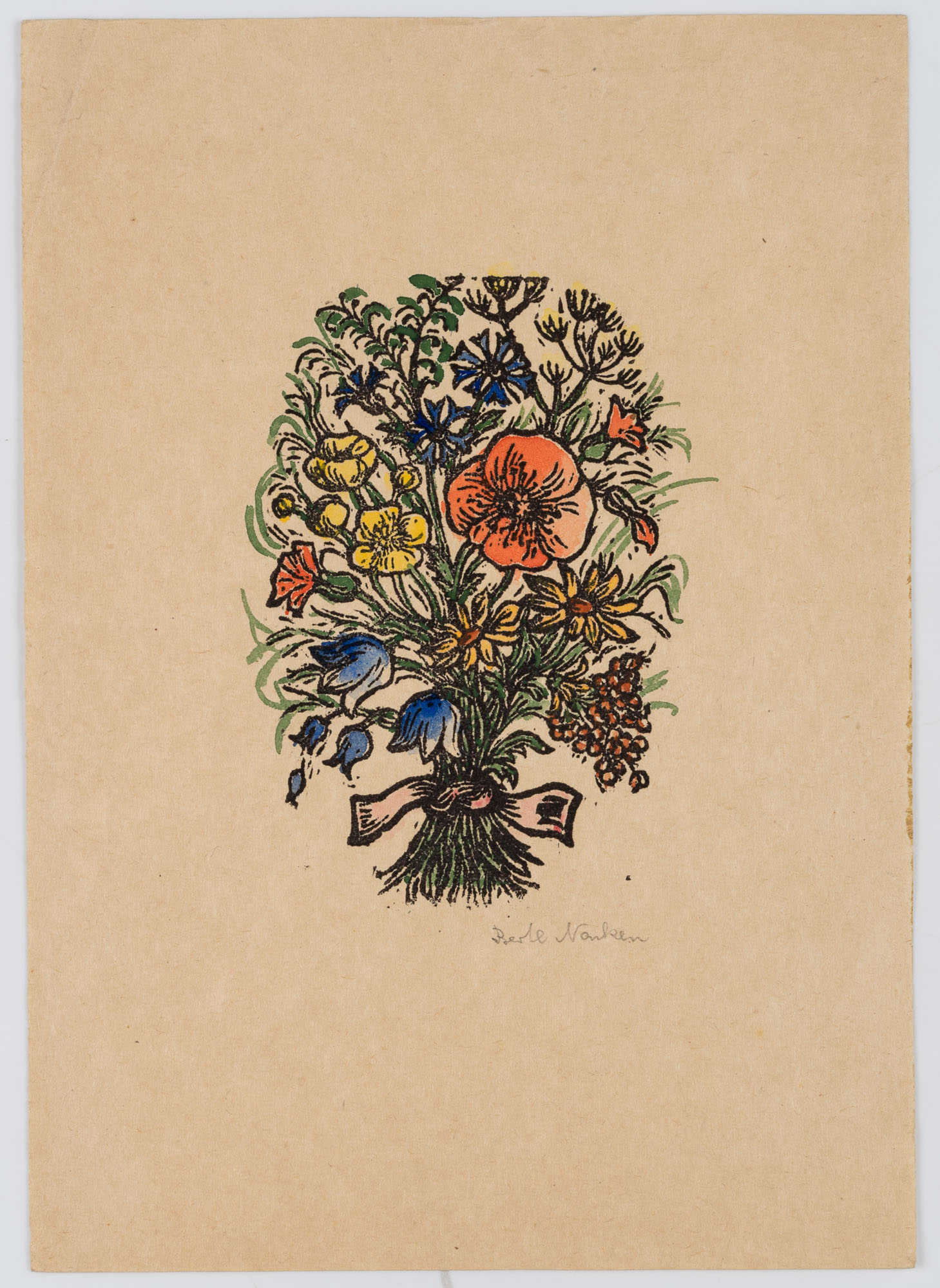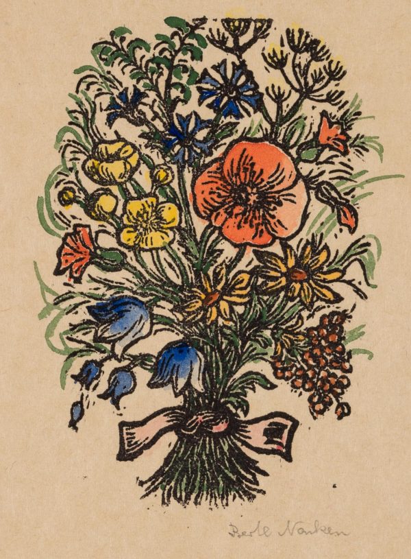 Berte Nacken (20th century), Flower bouquet of meadow flowers, bluebell, poppy, dill, carnation, c. 1940, Woodcut