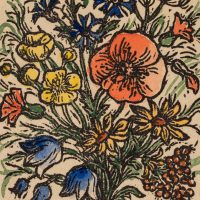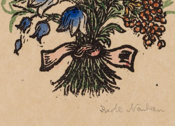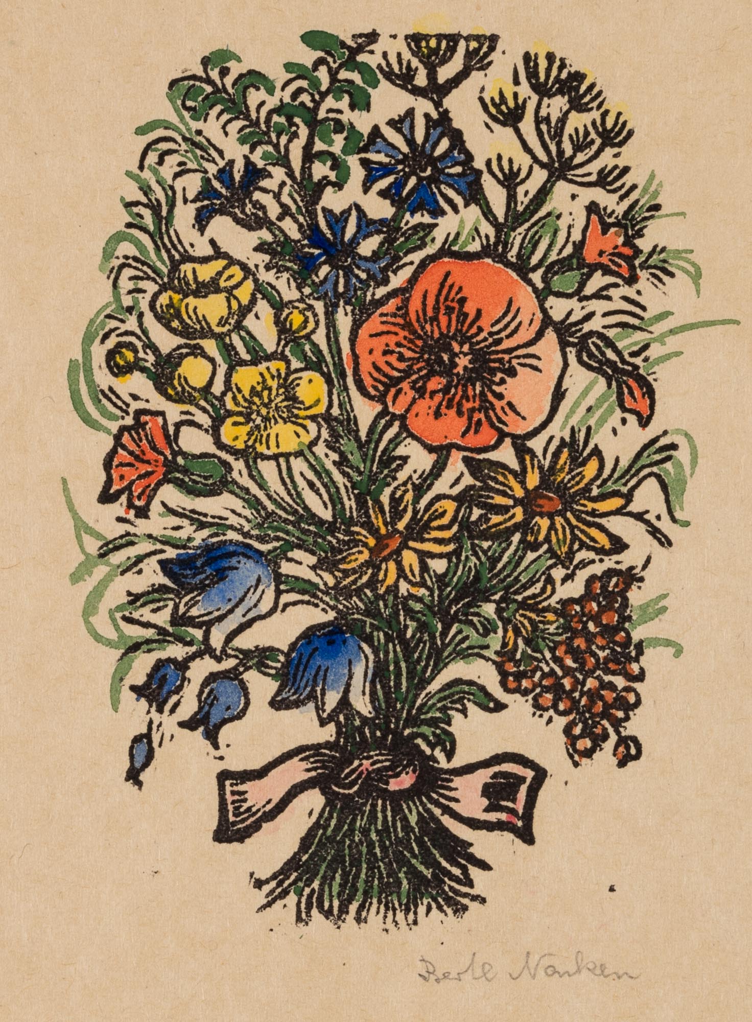Berte Nacken (20. Jahrhundert), Blumenbouquet aus Wiesenblumen, Glockenblume, Mohnblume, Dill, Nelke, um 1940, Holzschnitt